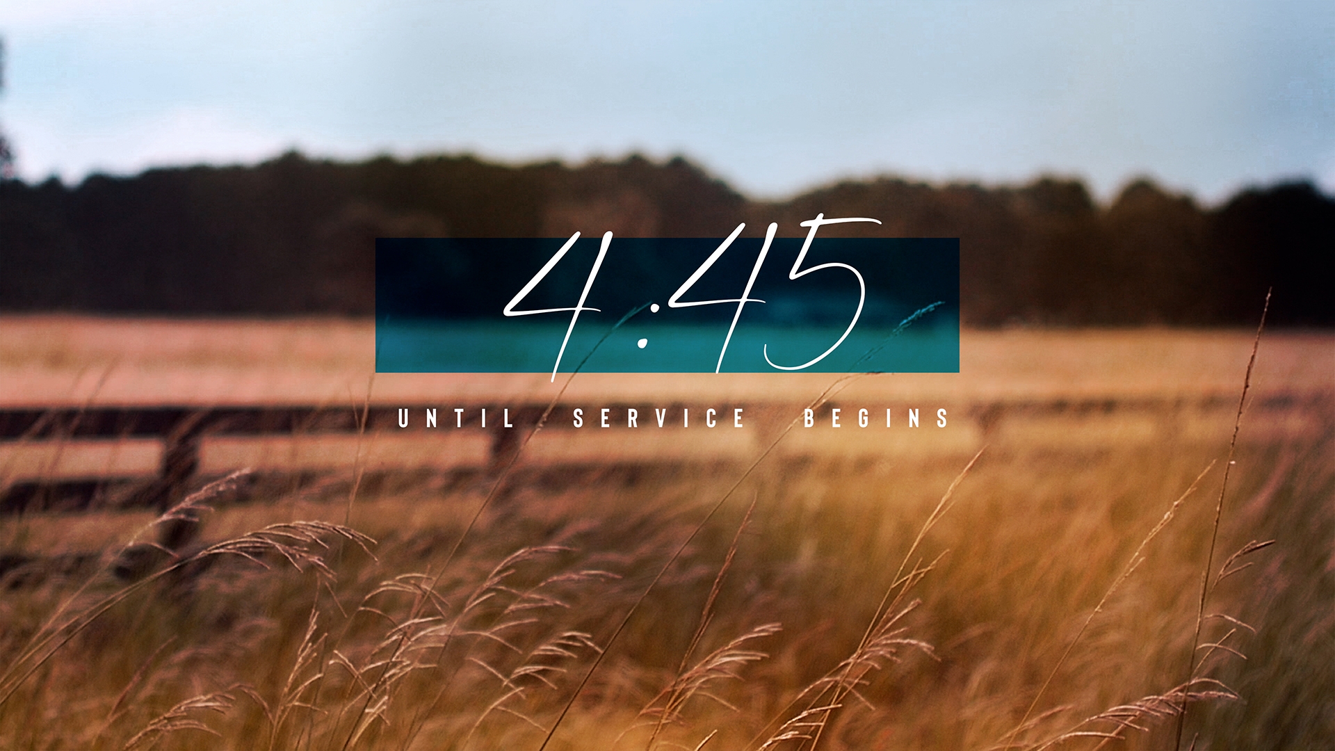 Amber fields countdown pre-service timer over scene of filmed grass fields in the Appalachian Mountains and surrounding farmlands.