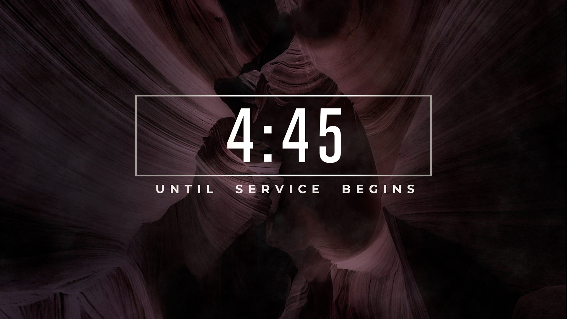 Canyon countdown pre-service timer over background of rising up through dark cinematic canyon walls, showcasing smooth, layered rock formations in varying shades of color and soft light filtering through, creating ethereal shadows and highlights.