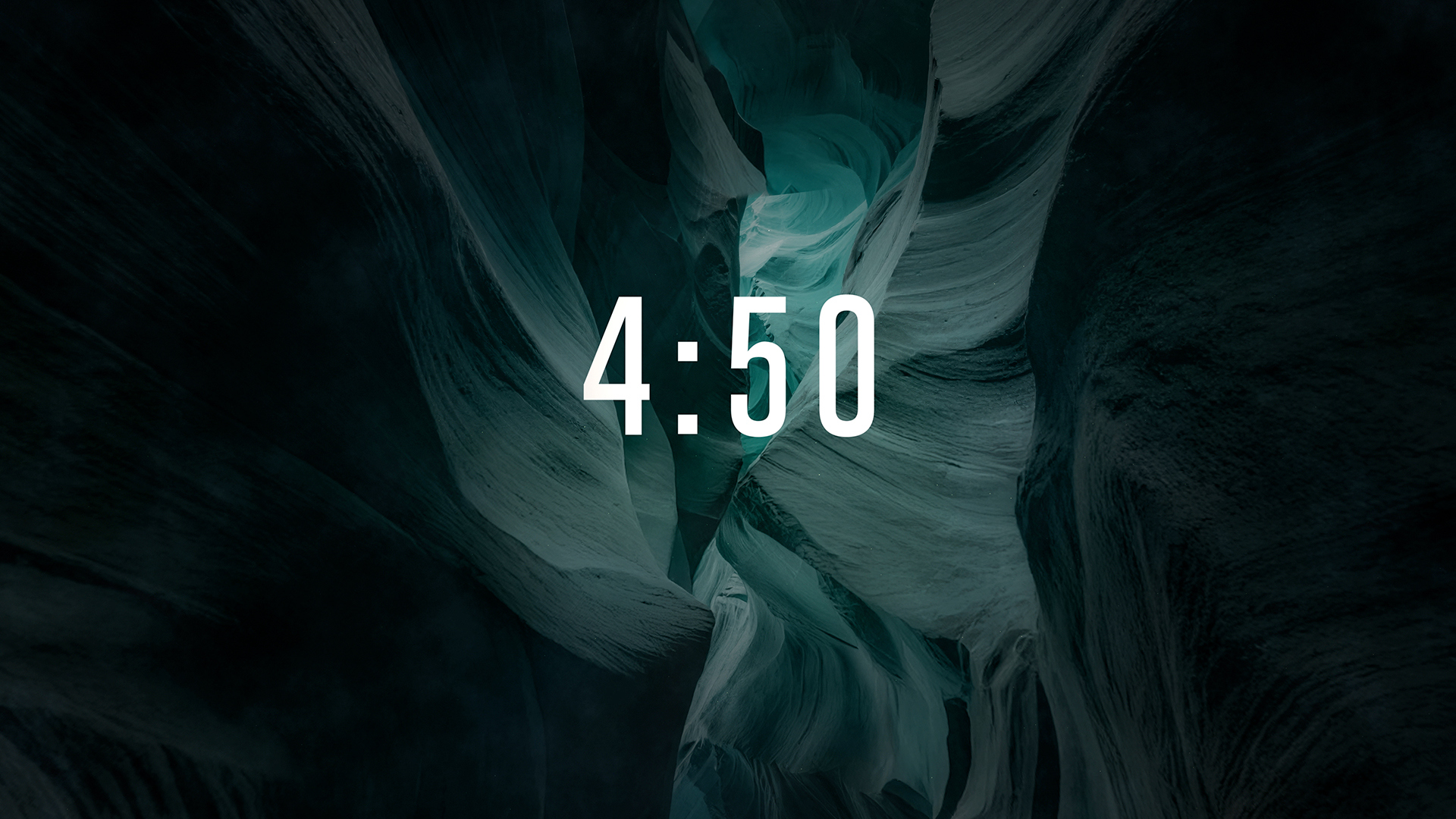 Canyon minimal countdown pre-service timer over background of rising up through dark cinematic canyon walls, showcasing smooth, layered rock formations in varying shades of color and soft light filtering through, creating ethereal shadows and highlights.