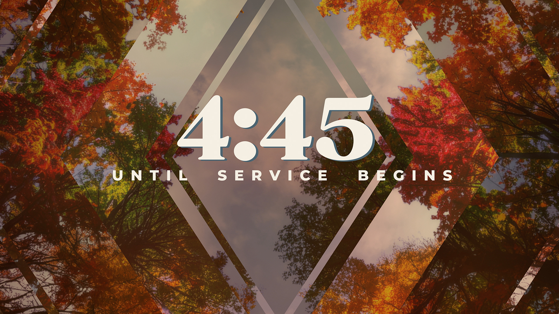 Fall trees countdown pre-service timer over vibrant autumn foliage from below mixed up geometrically, featuring a mix of fall colored leaves surrounded by a soft blue sky with subtle clouds.
