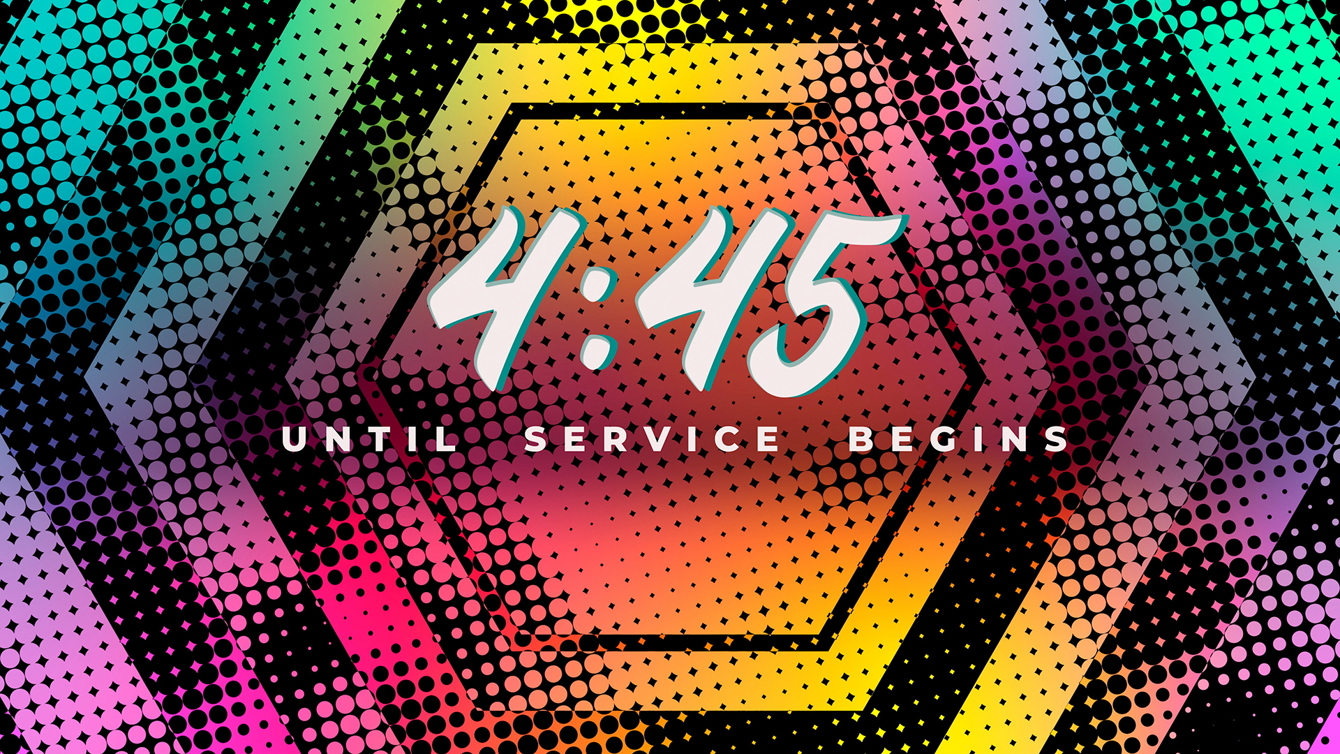 A vibrant summer countdown pre-service timer of halftones and inverted halftones in subtle directional movement and fractal variance blended with bright colorful gradients and composed in geometric shapes.