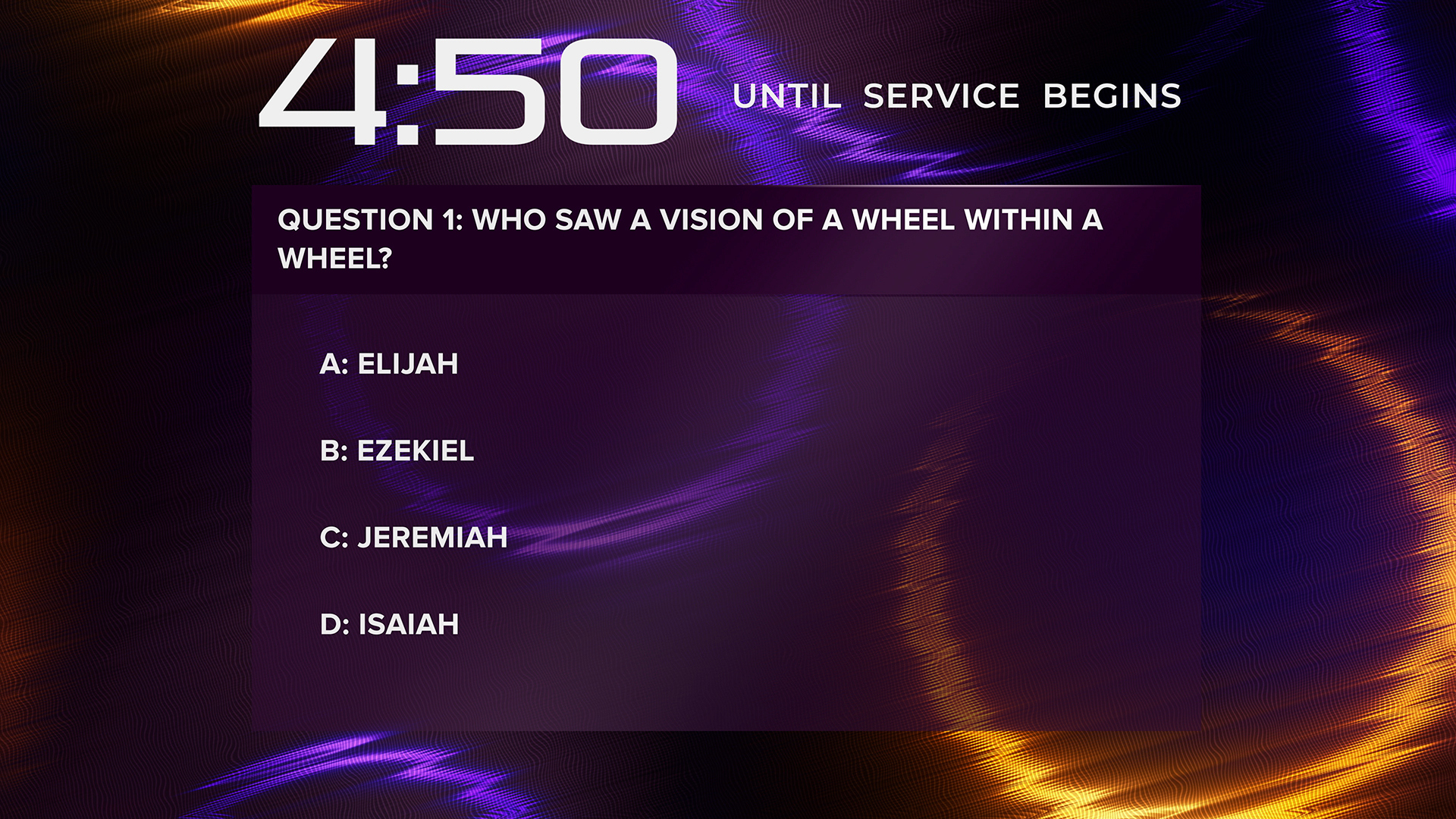 Neon glass bible trivia countdown pre-service timer over glass grid background featuring vibrant, glowing circles in intense neon colors against a dark backdrop.