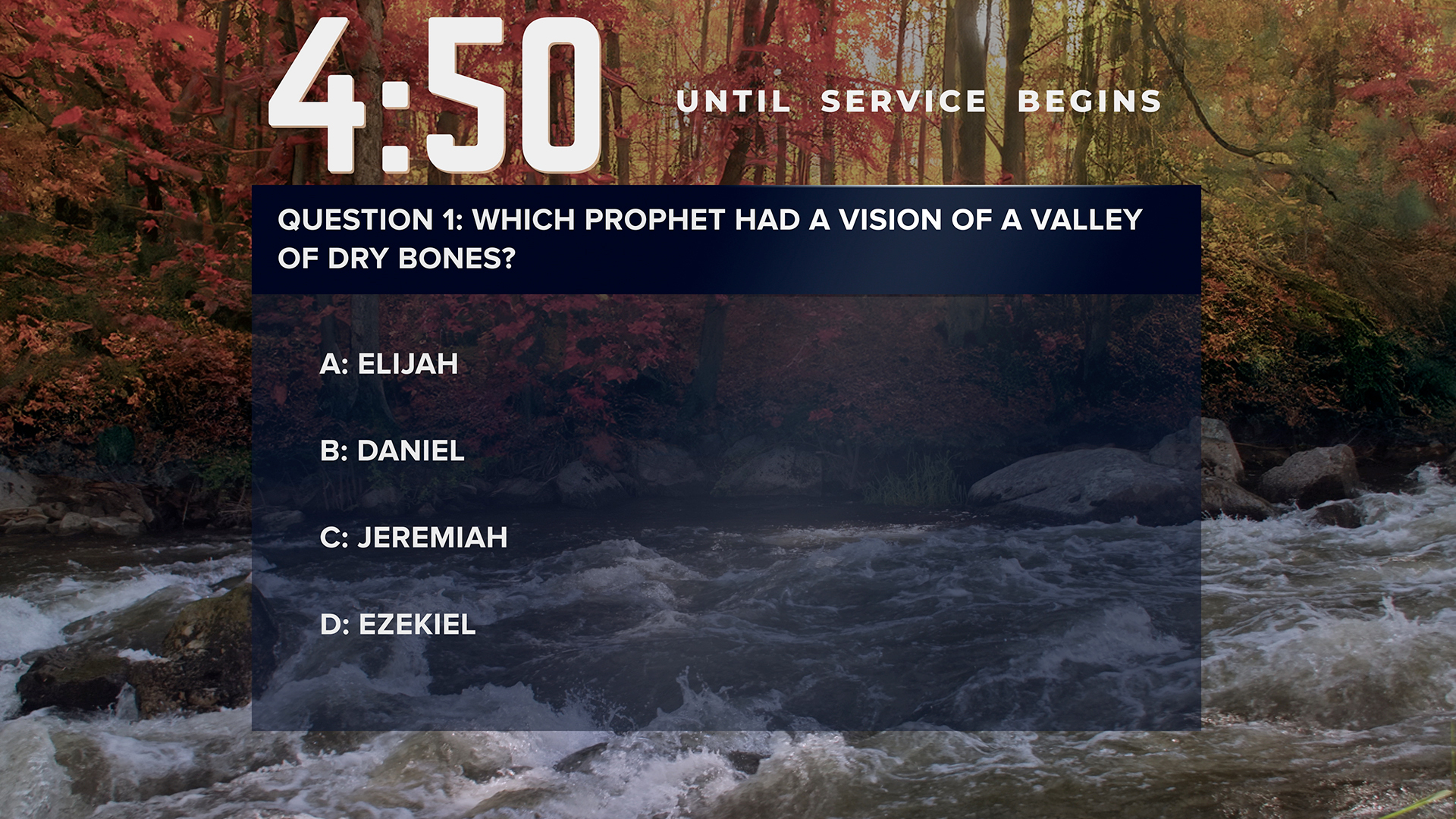 Fall river bible trivia countdown pre-service timer over fall scene with winding river flowing through a vibrant autumnal forest including many vibrant orange, yellow, red, and green trees and large rocks lining the river bank.