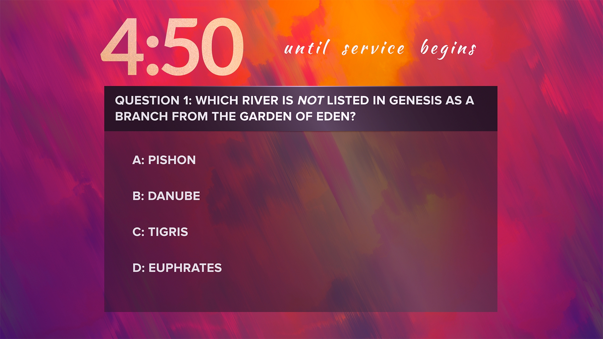 Painted bible trivia countdown pre-service timer over pixel sorted fall background with vibrant colors in subtle hand drawn abstract style.