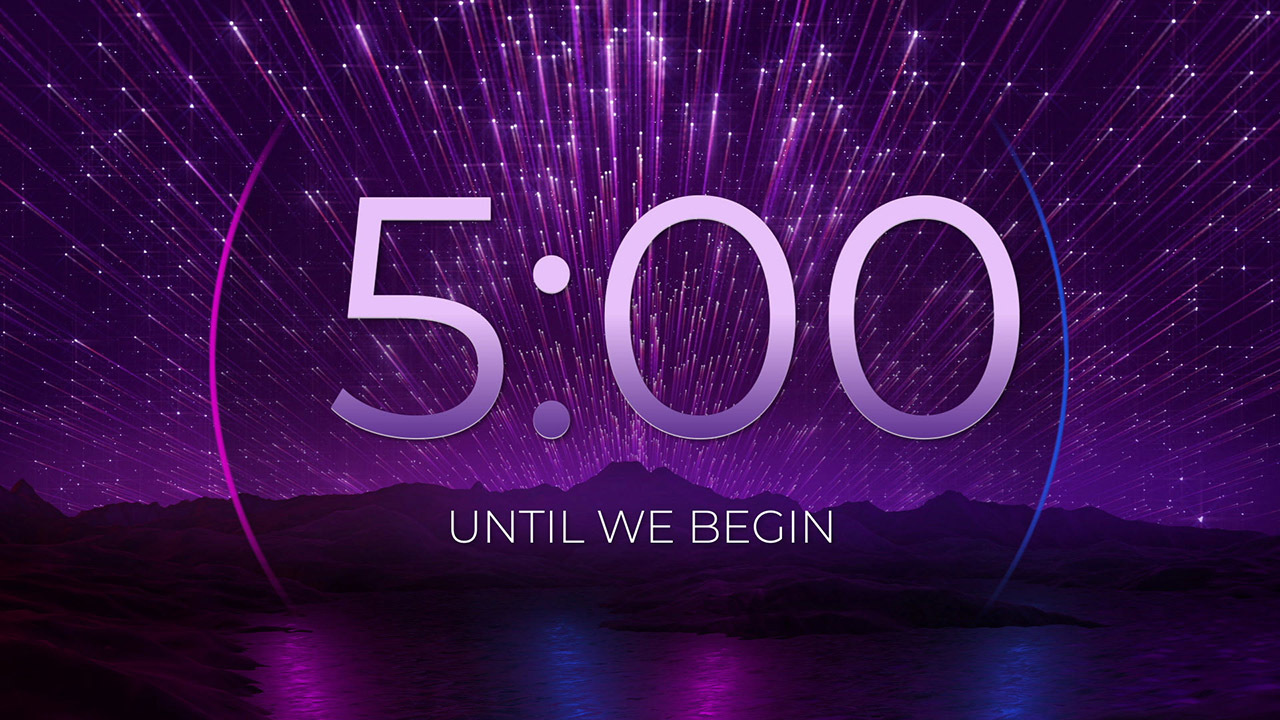 Create an inspiring and worshipful mood for your church service with this beautiful 5-minute countdown. Its modern design features a magnificent mountain lake with an angelic sky full of shooting stars. The innovative color scheme makes this five-minute countdown a must-have addition to your church media library. This church countdown is part of the Starscape Theme Pack, which is sold separately. By using all of the media found in the collection, you will bring continuity to your worship service.