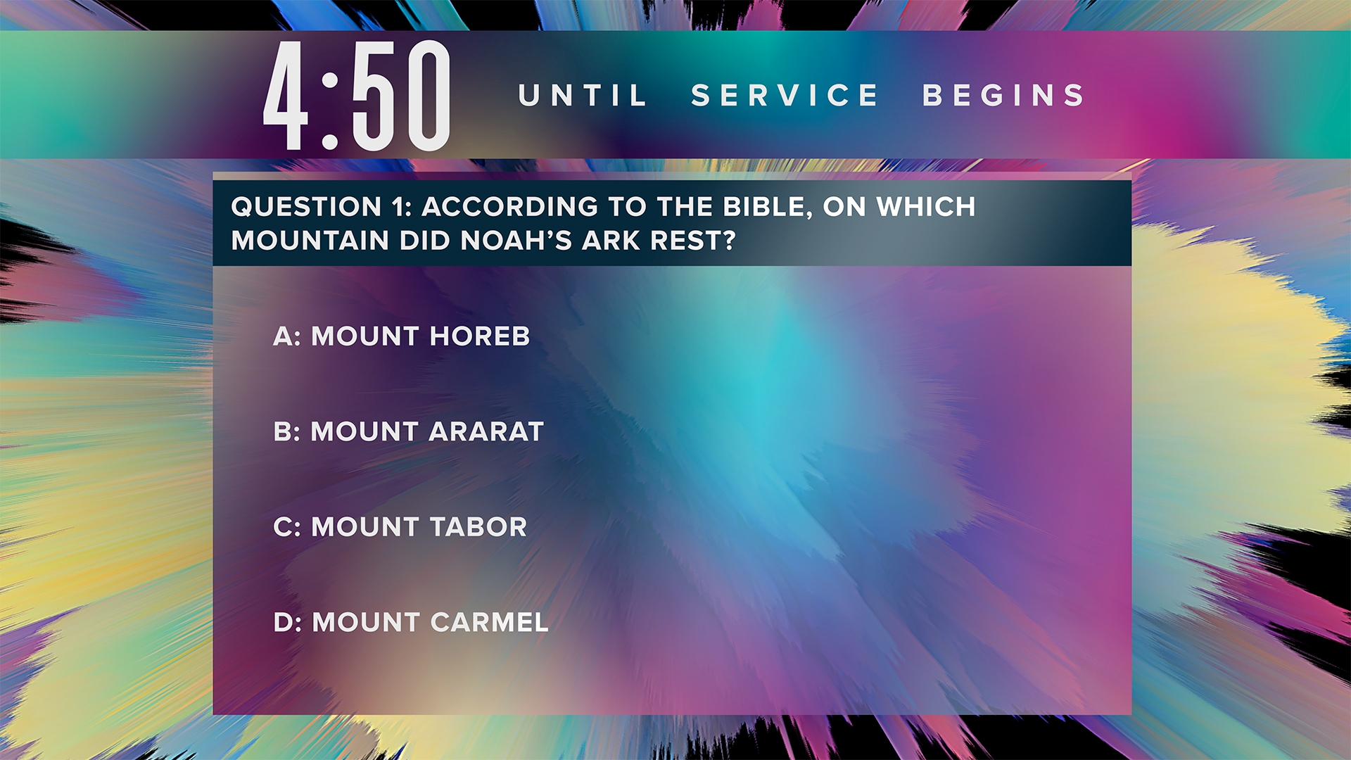 Sunsplash bible trivia countdown pre-service timer over color explosions with vibrant colors in subtle linear movement.