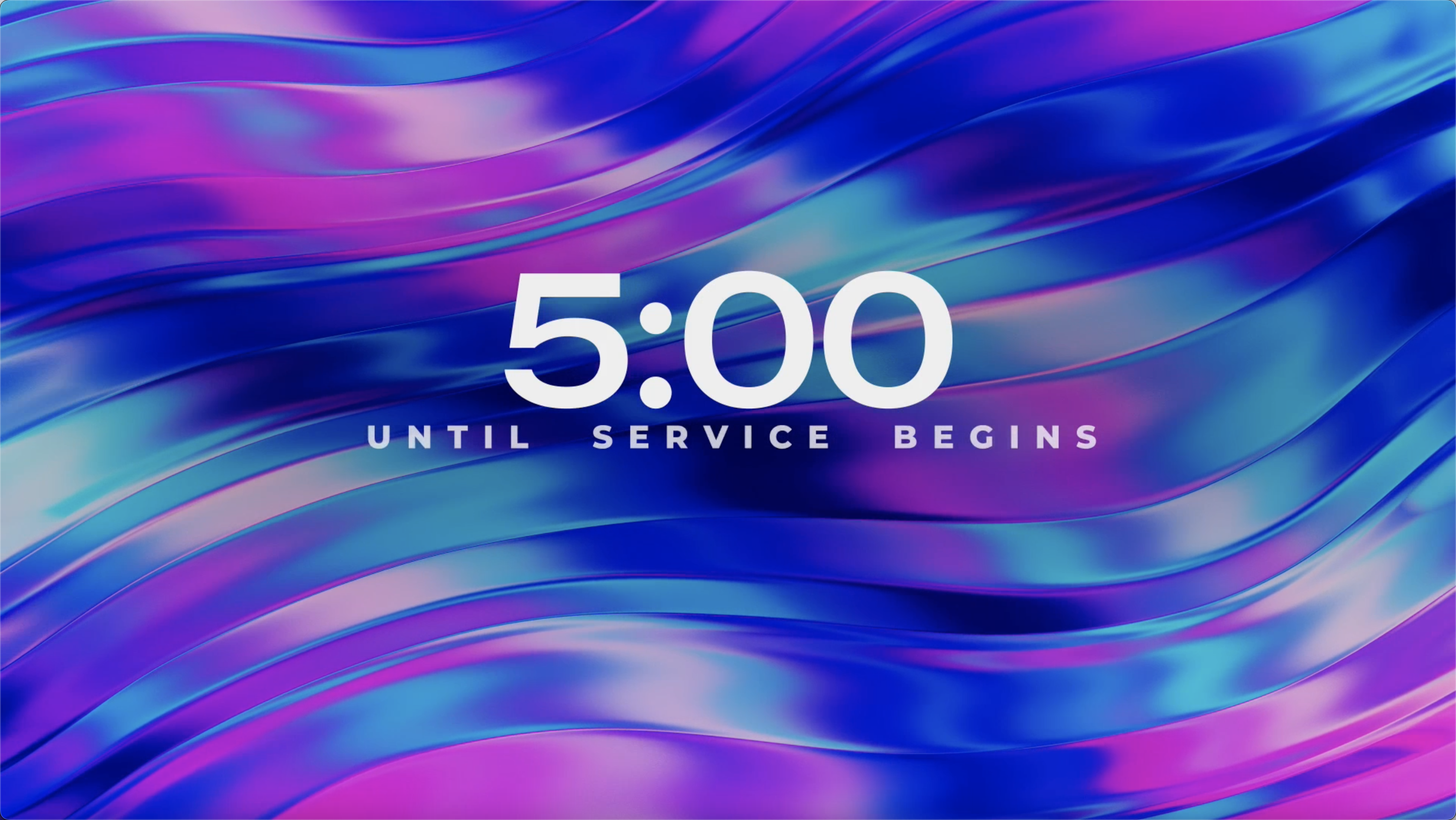 Colorful abstract countdown pre-service timer over glossy metallic waves.