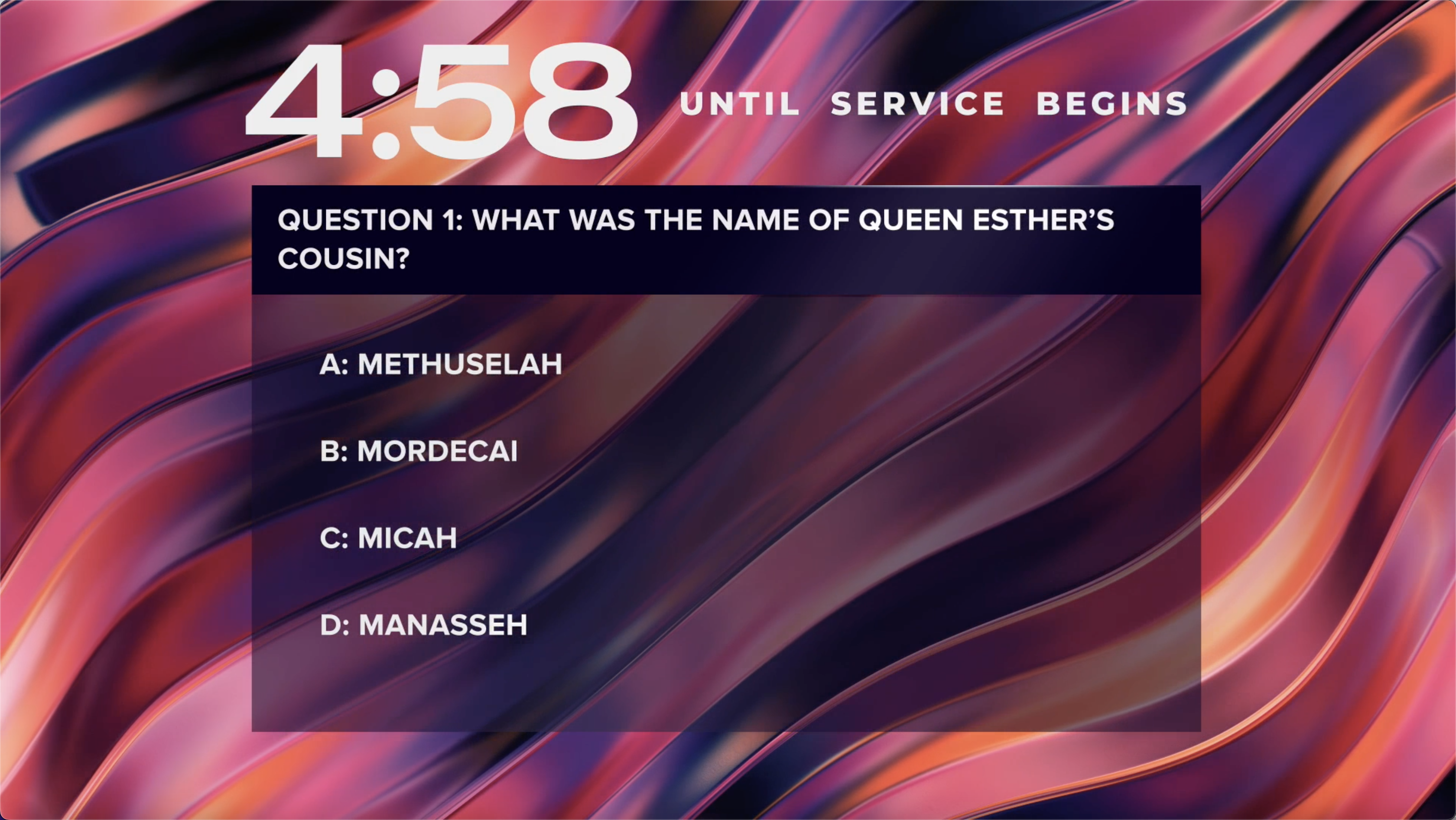 Colorful abstract bible trivia countdown pre-service timer over glossy metallic waves.
