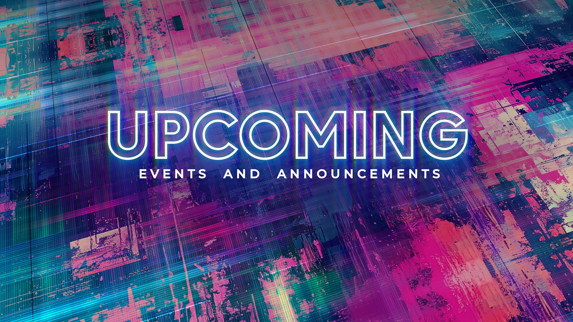 Abstract digital distortion upcoming events and announcements title motion over chromatic glow distortion patterns with bright colors.