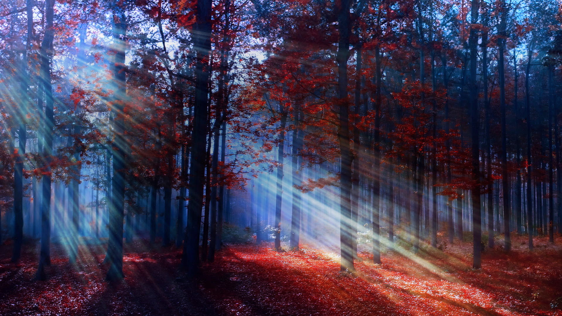 A serene autumn forest worship background with tall trees and vibrant fall leaves. Sunlight beams filter through the branches, creating golden rays that illuminate the misty atmosphere with fallen leaves covering the ground.