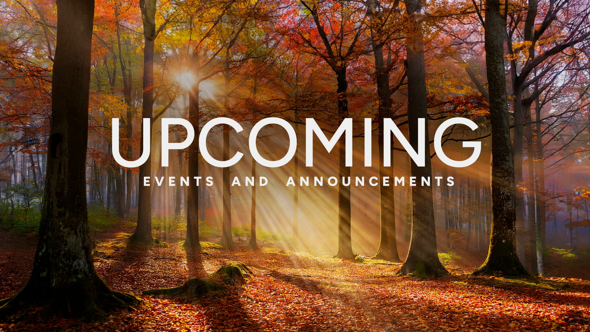 Autumn light upcoming events and announcements title motion over a serene fall forest scene with sunlight beams filtering through trees and fallen autumn leaves covering the ground.