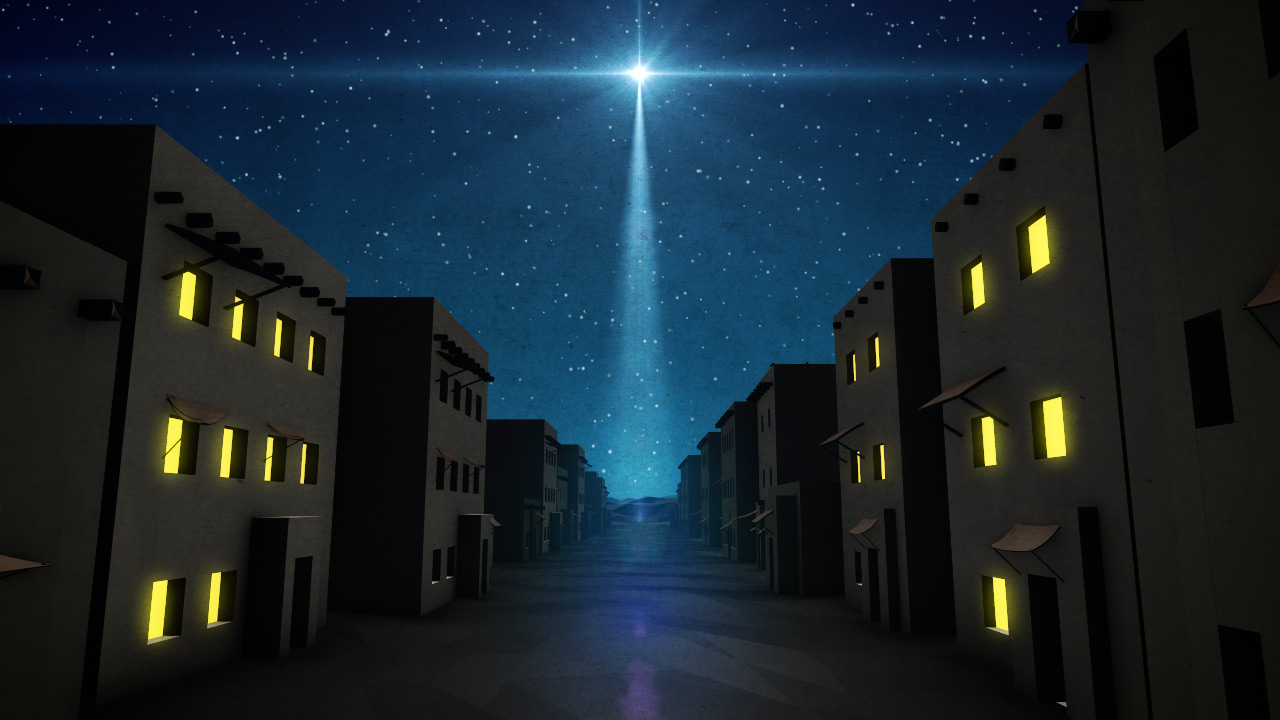 This Christmas motion background presents a view down a Bethlehem street at night, with a brilliant star pointing to the birthplace of Jesus. Features glowing windows, twinkling stars, and mountains.