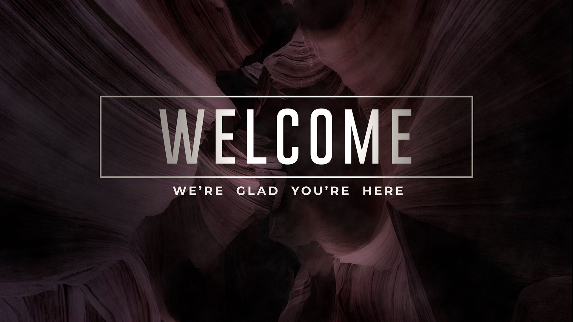 Canyon Welcome motion title over background of rising up through dark cinematic canyon walls, showcasing smooth, layered rock formations in varying shades of color and soft light filtering through, creating ethereal shadows and highlights.