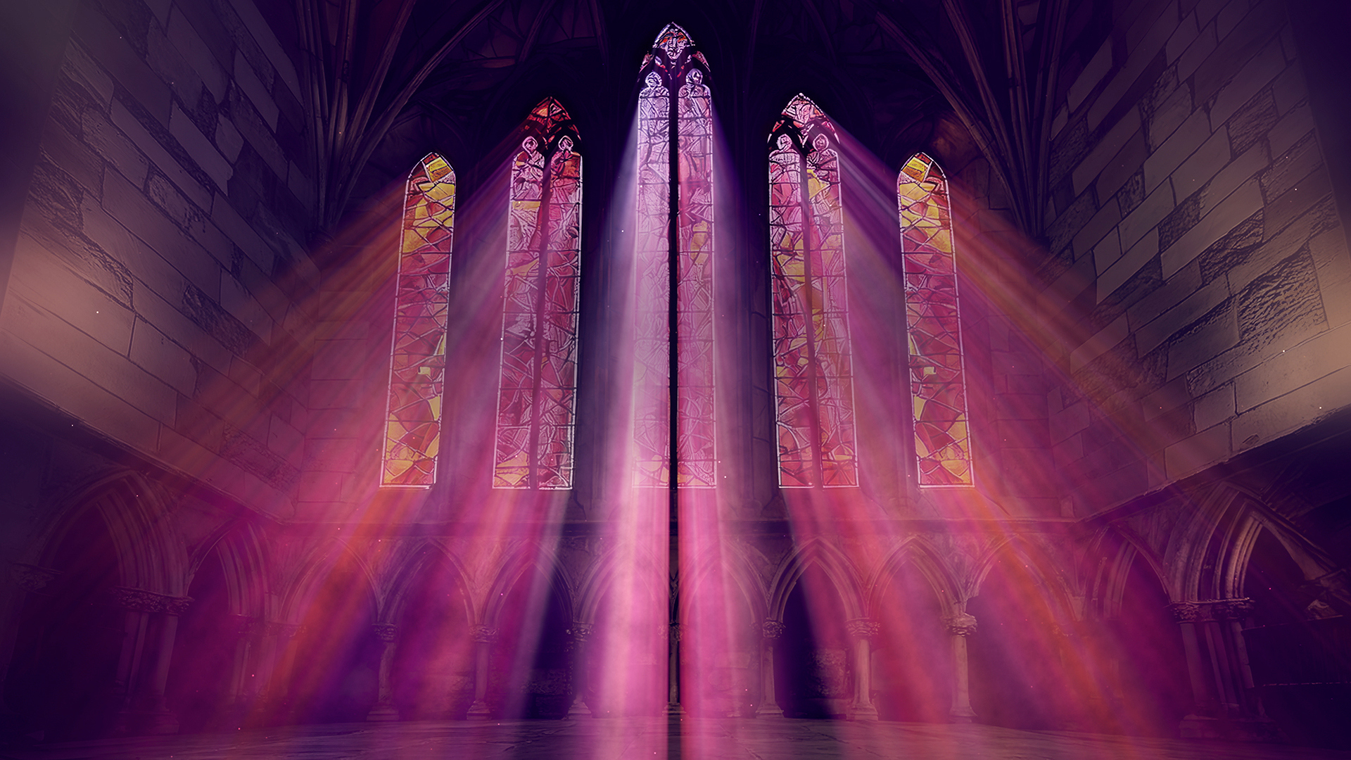 Stained glass cathedral worship background animation with vibrant colorful shimmering light rays flowing from different stained glass color schemes and realistic cathedral rooms with floating dust in the atmosphere.