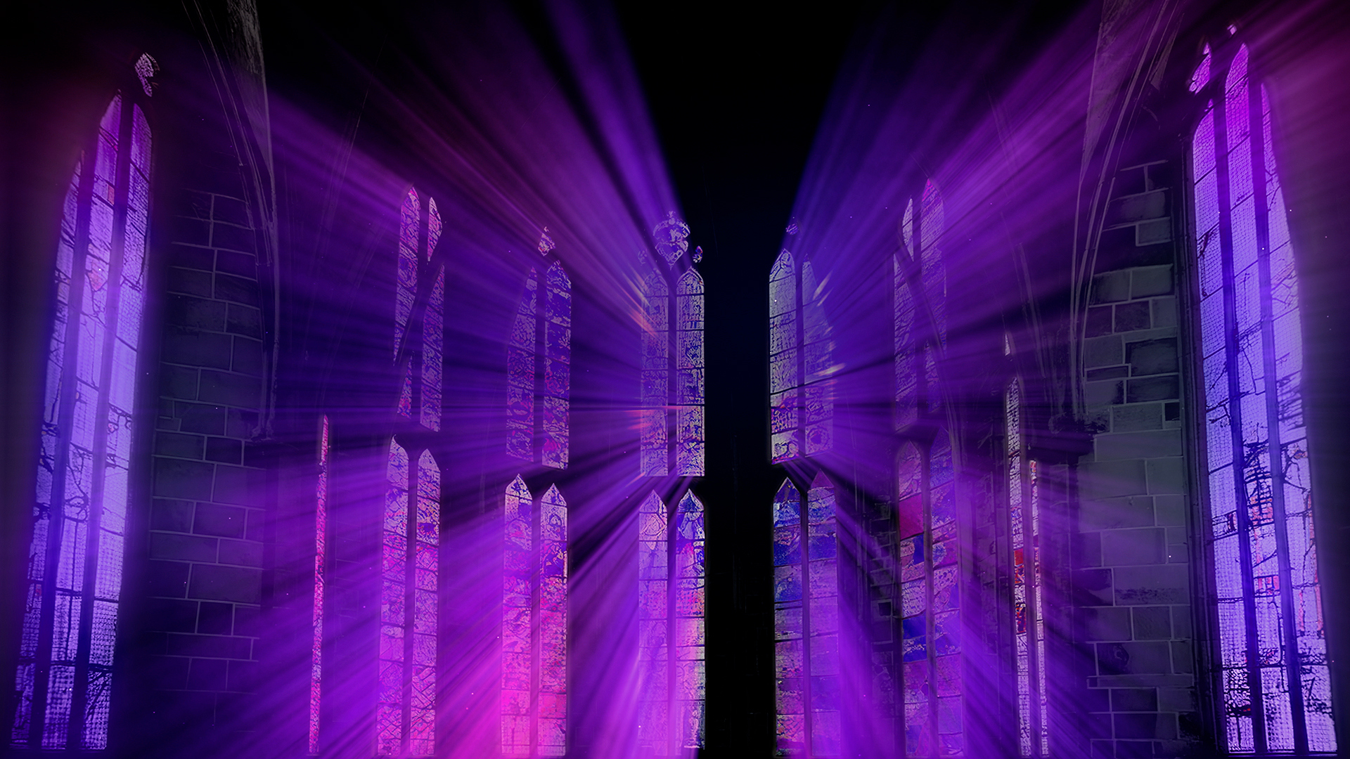 Stained glass cathedral worship background animation with vibrant colorful shimmering light rays flowing from different stained glass color schemes and realistic cathedral rooms with floating dust in the atmosphere.