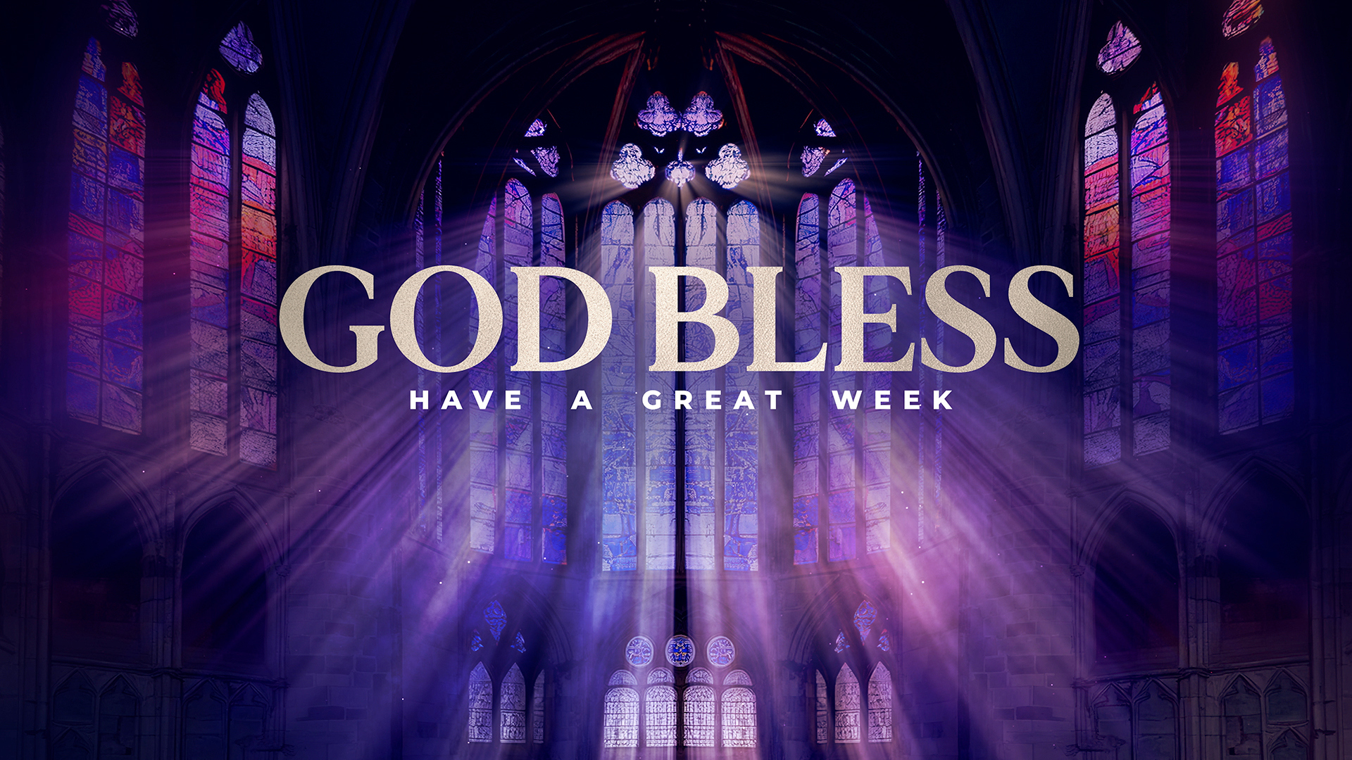 Stained Glass Cathedral service close title motion over vibrant colorful shimmering light rays flowing from different stained glass color schemes and realistic cathedral rooms with floating dust in the atmosphere.