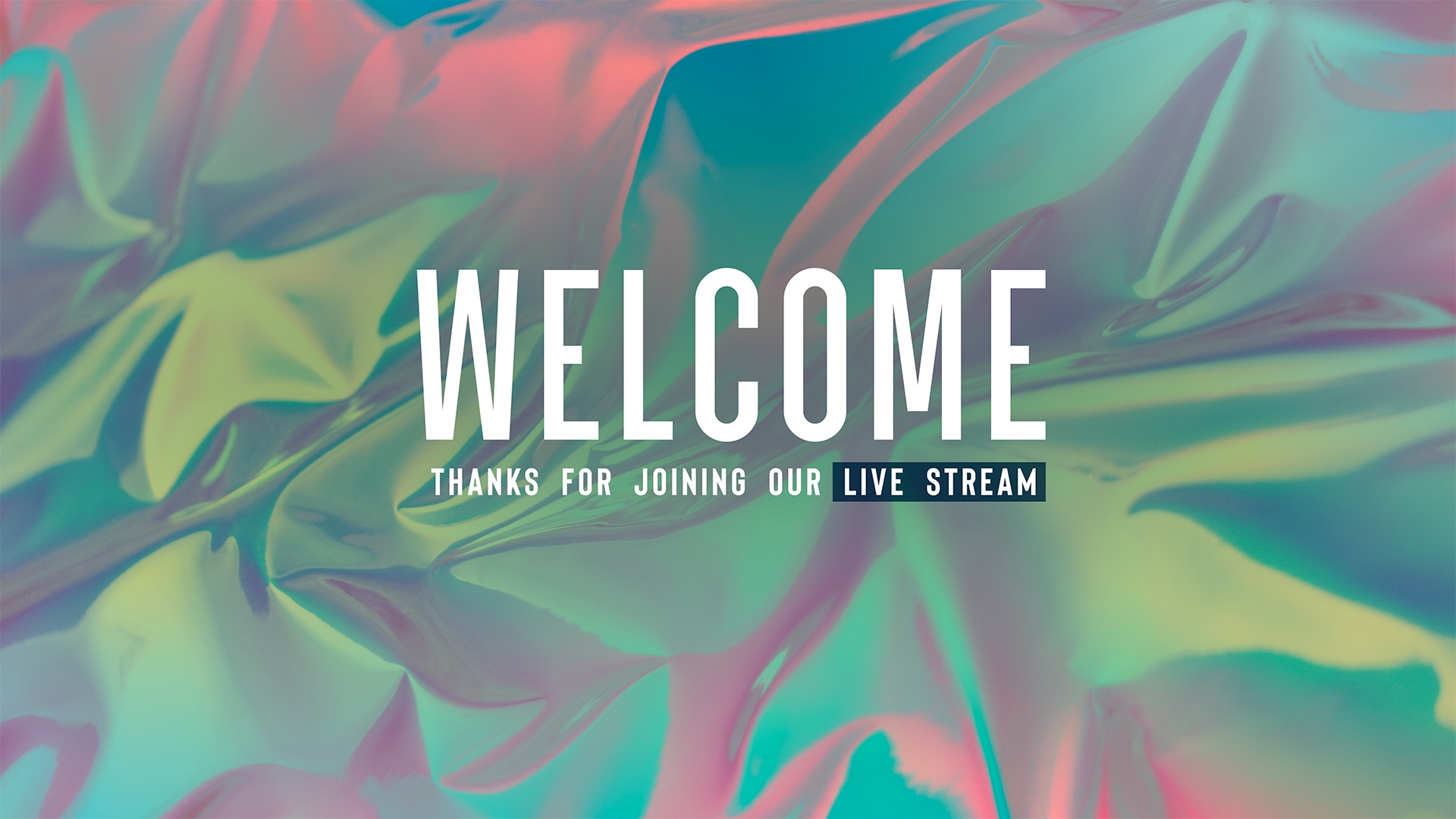 Chroma wave holographic stream welcome title motion for online church over iridescent film background loop.
