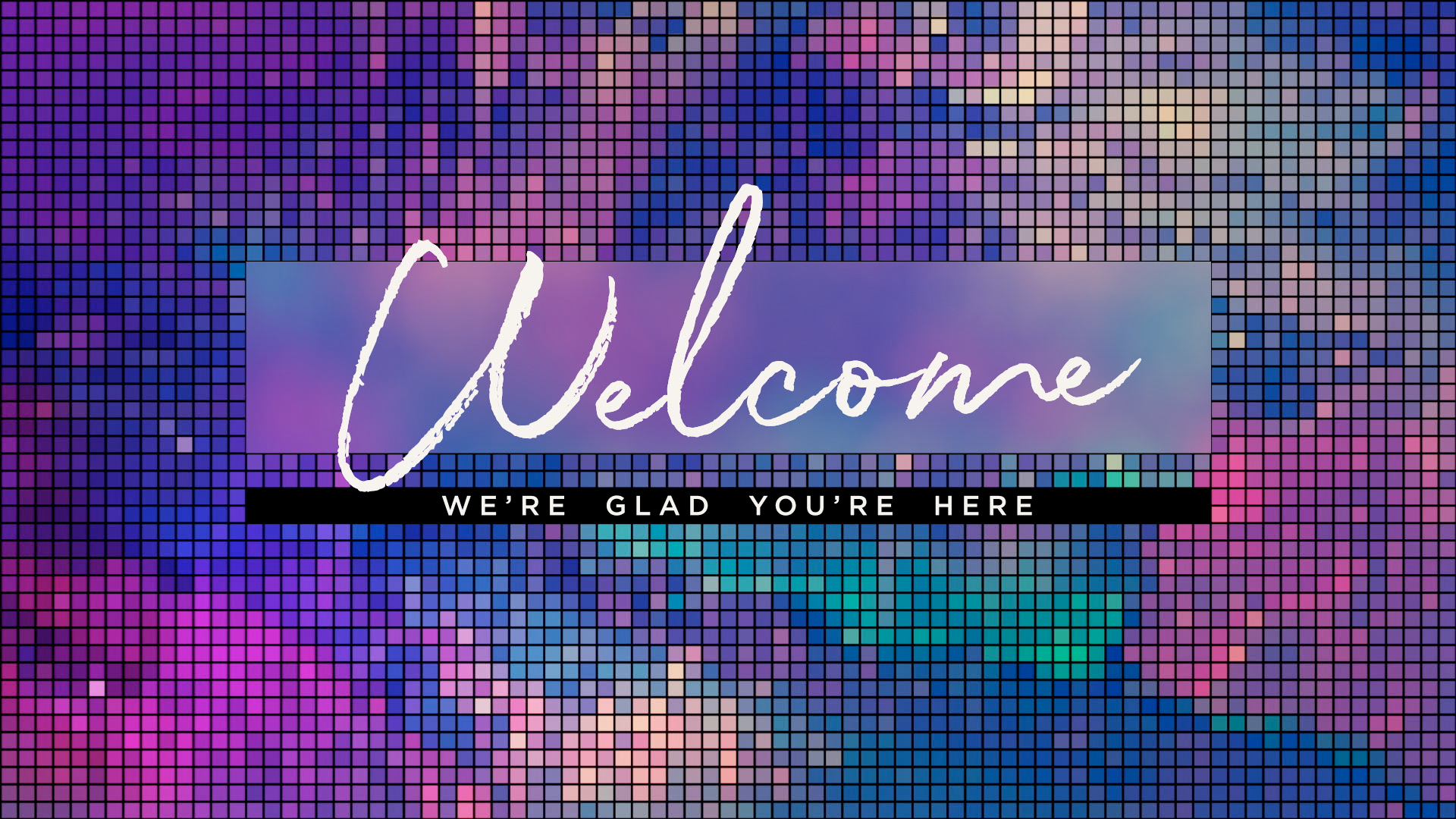 LED style grid welcome title animation over background loop of colorful led scene.