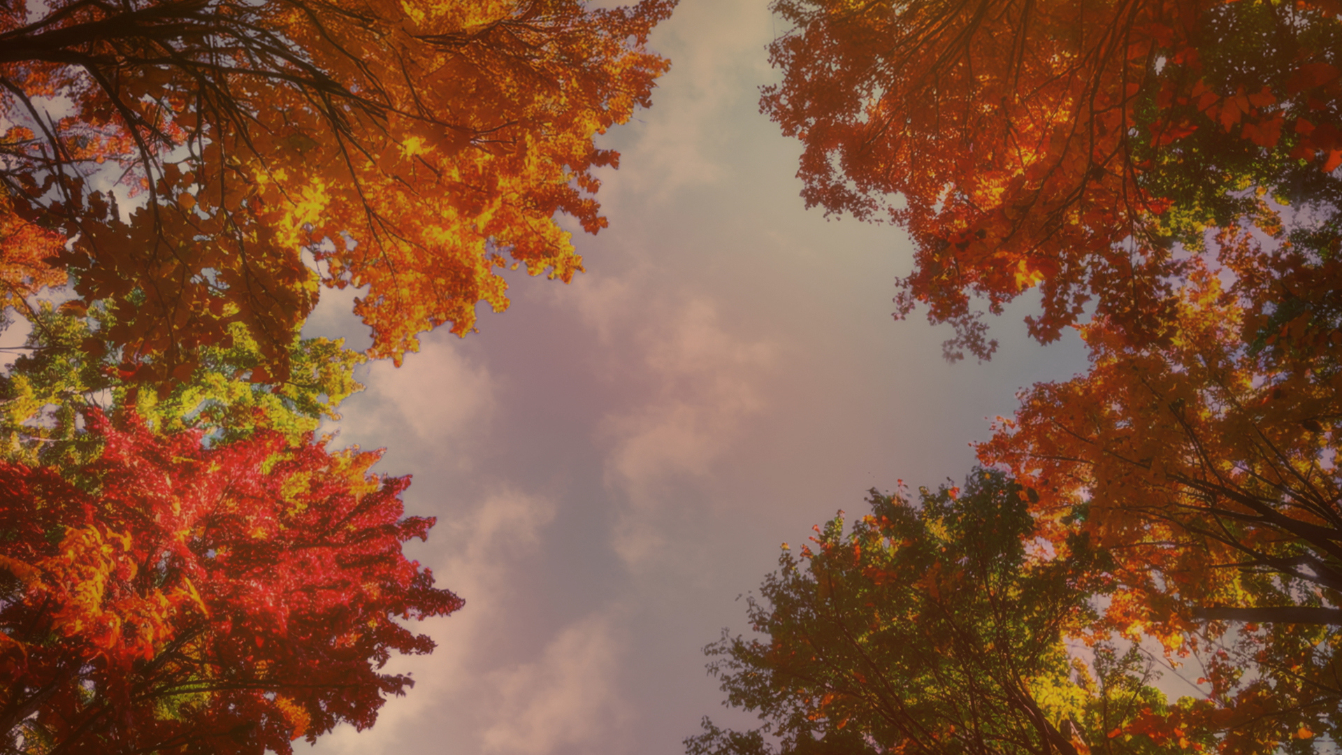 Fall trees worship background of vibrant autumn foliage from below, featuring a mix of fall colored leaves surrounded by a soft blue sky with subtle clouds.