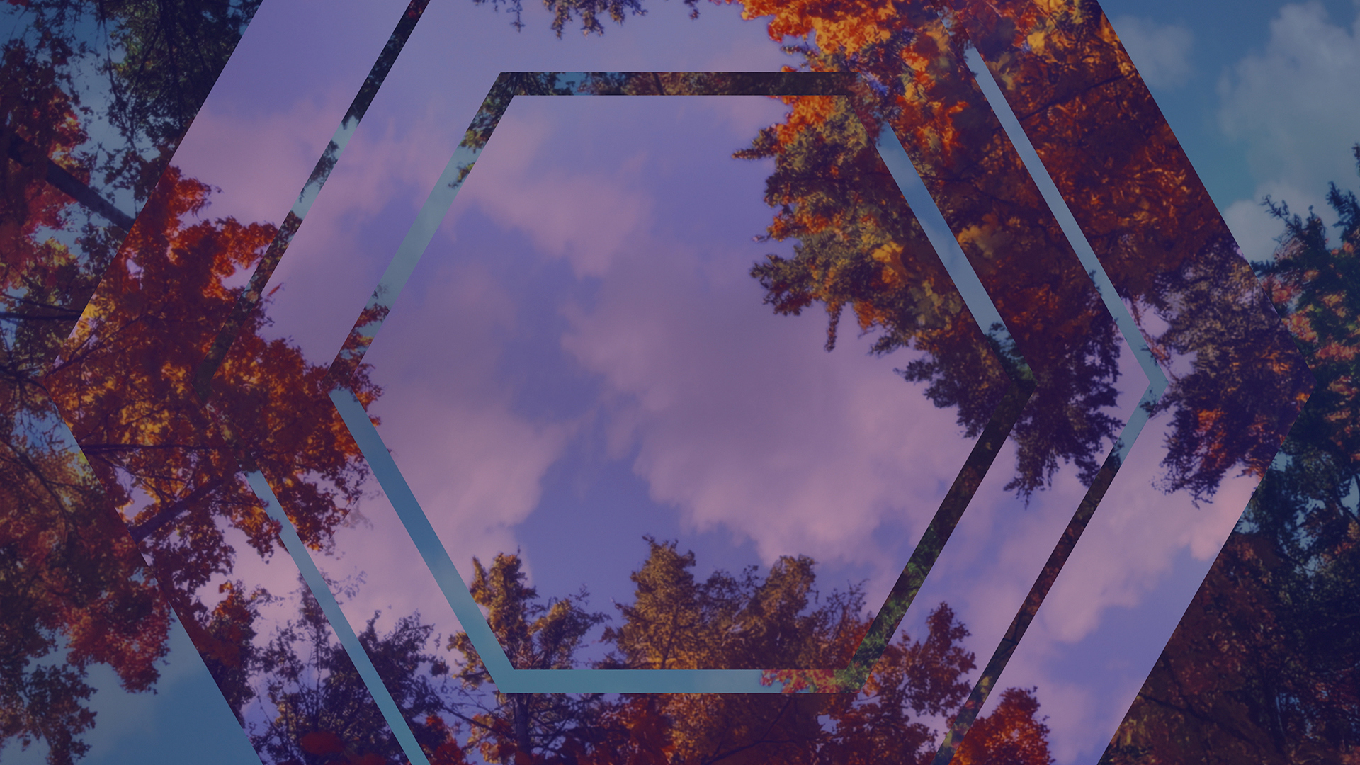 Fall trees worship background with geometric mixup of vibrant autumn foliage from below, featuring a mix of fall colored leaves surrounded by a soft blue sky with subtle clouds.
