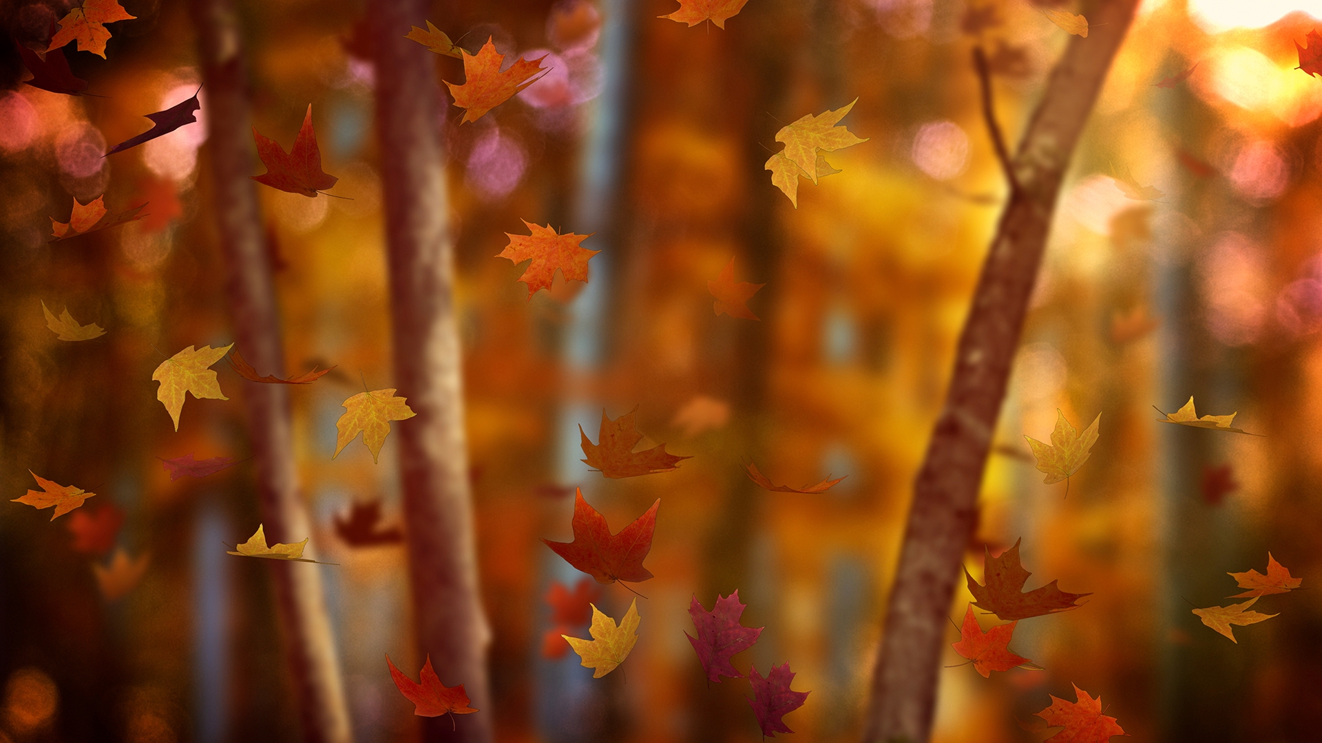Fall woods scene worship motion with a soft focus background of an Autumn forest of trees and vibrant, colorful, falling leaves.