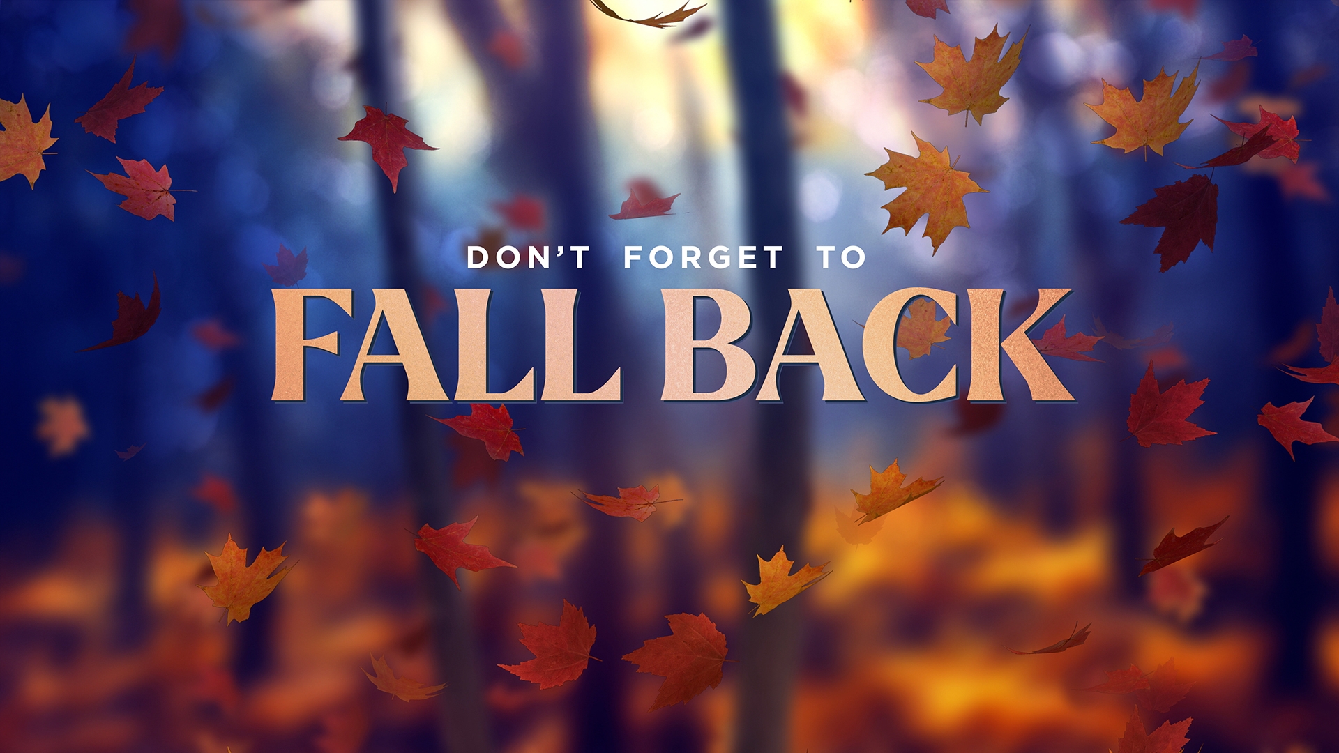 Fall woods fall back time change motion title over soft focus background of an Autumn forest of trees and vibrant, colorful, falling leaves.