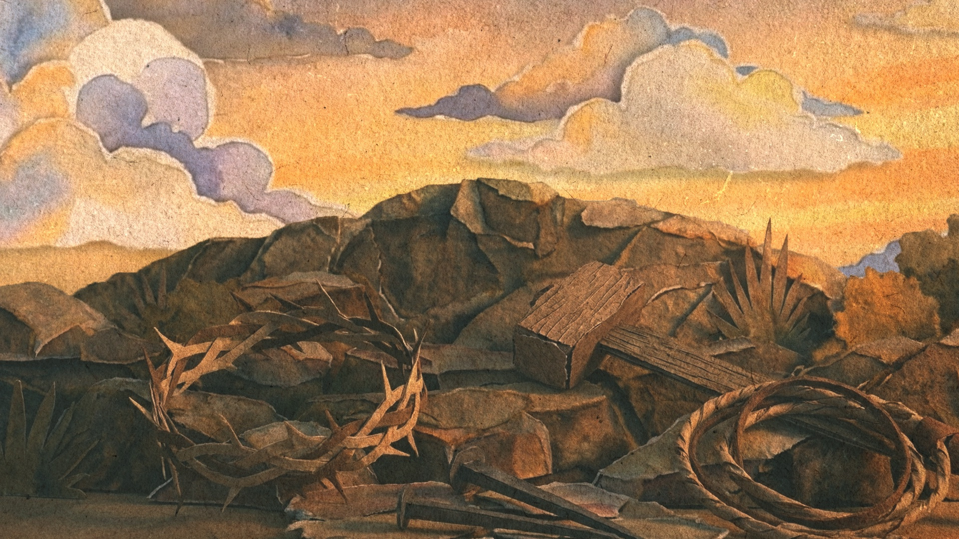 This motion background image features symbols from the crucifixion, including a crown of thorns, spikes, a hammer, and a whip. Use it behind worship or message slides for your Good Friday service.