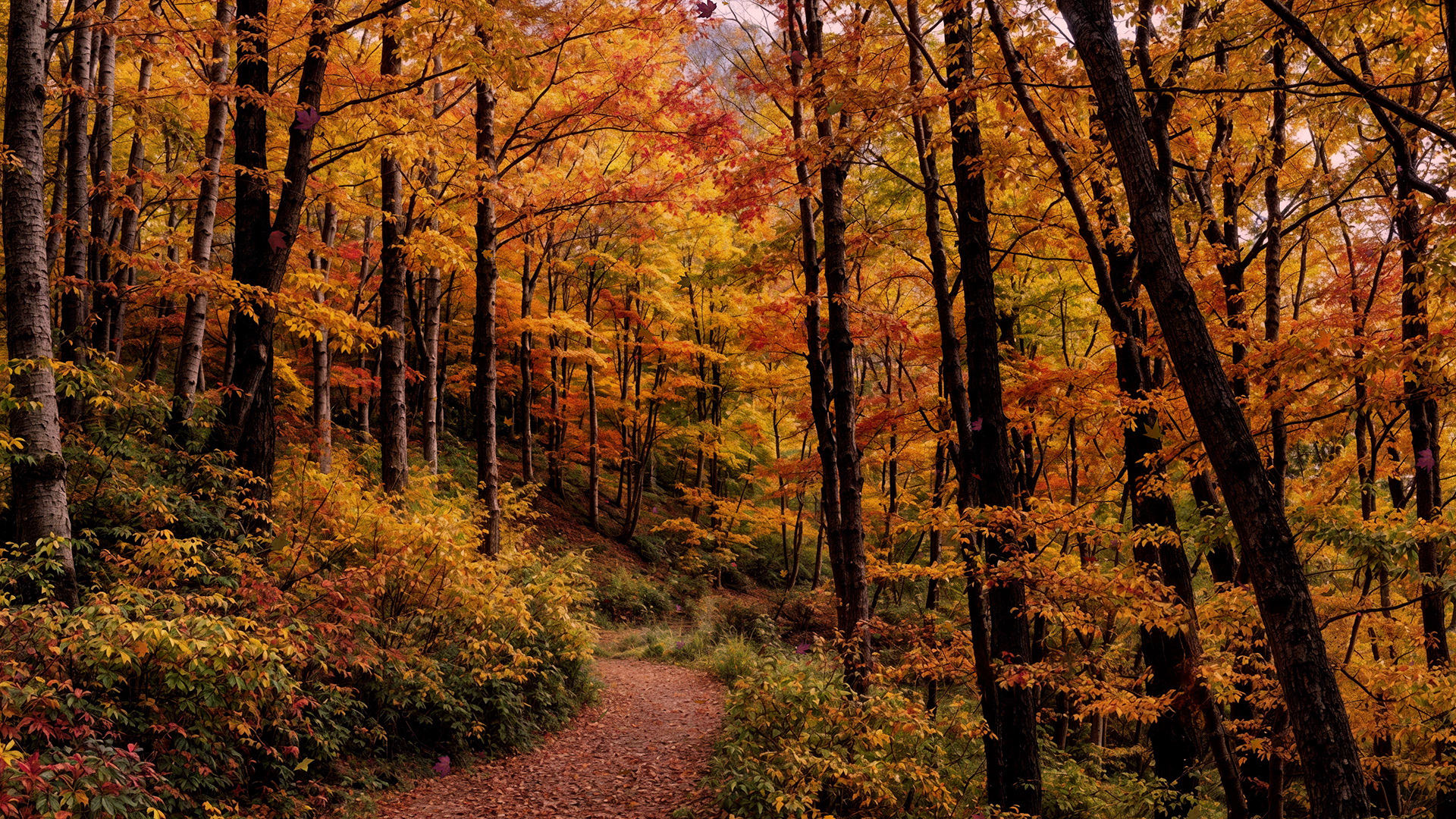 A vibrant forest worship background loop in autumn with falling leaves, framed by tall trees adorned with colorful leaves in shades of orange, yellow, and red.