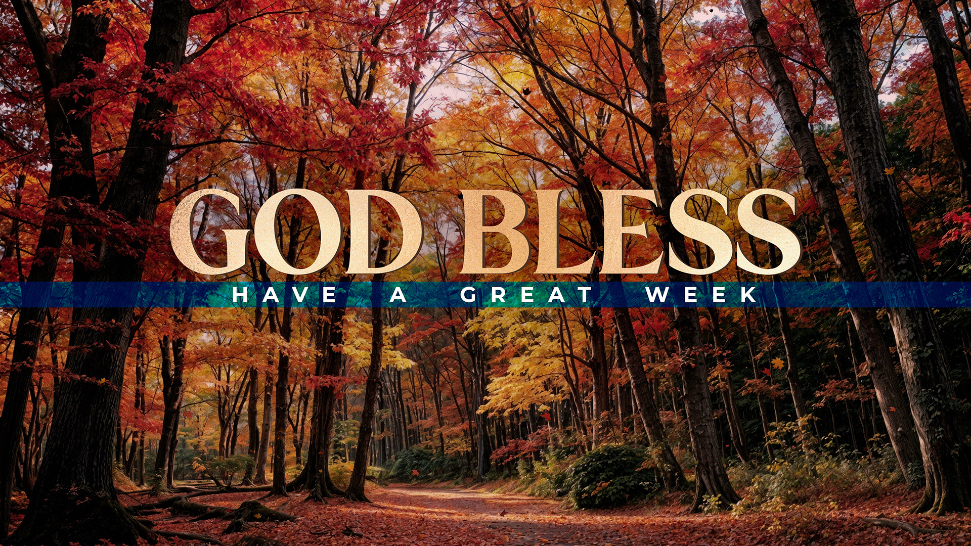 A vibrant forest service close title motion in autumn with falling leaves, framed by tall trees adorned with colorful leaves in shades of orange, yellow, and red.