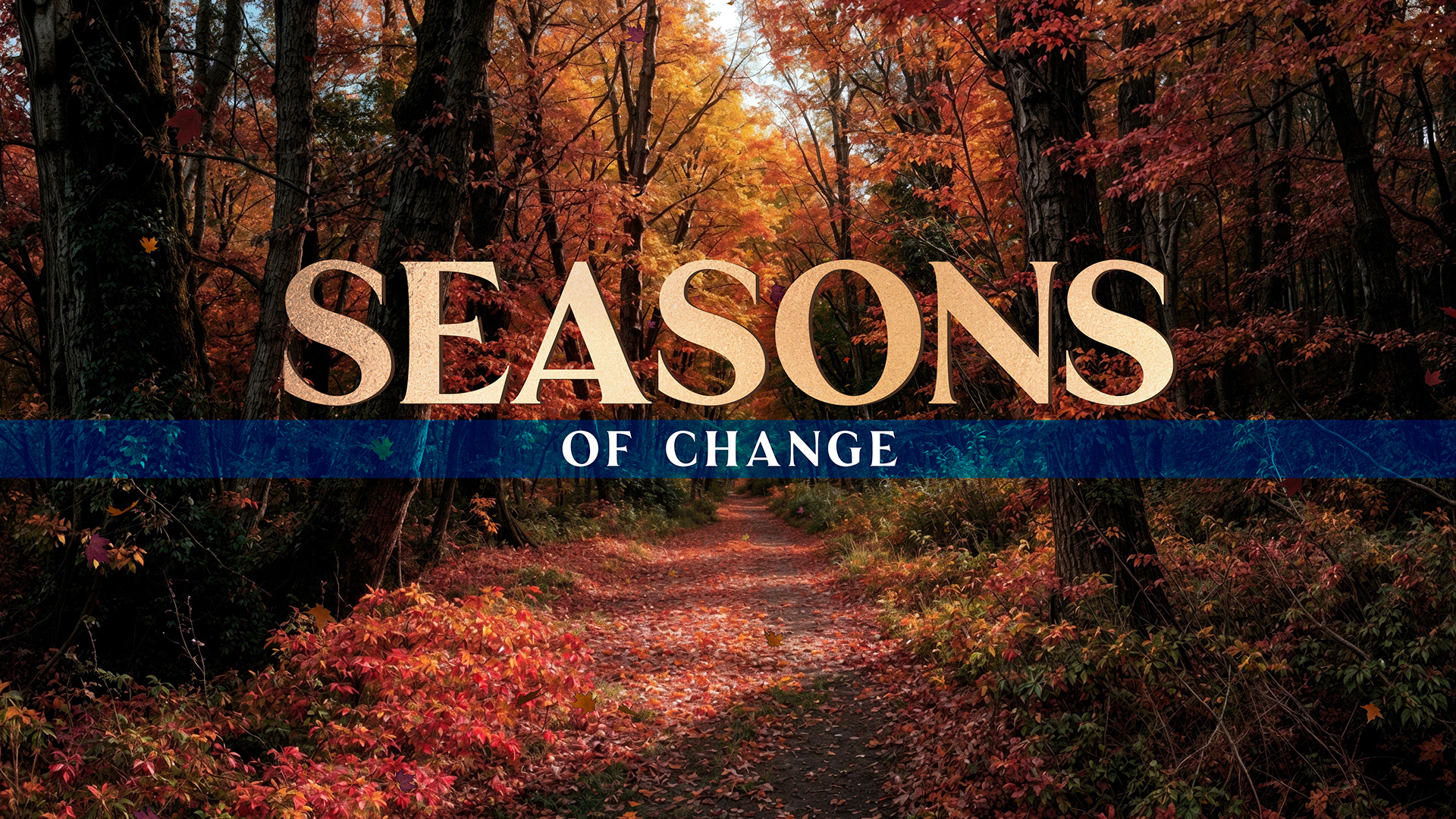 A vibrant forest sermon title motion “seasons of change” in autumn with falling leaves, framed by tall trees adorned with colorful leaves in shades of orange, yellow, and red.
