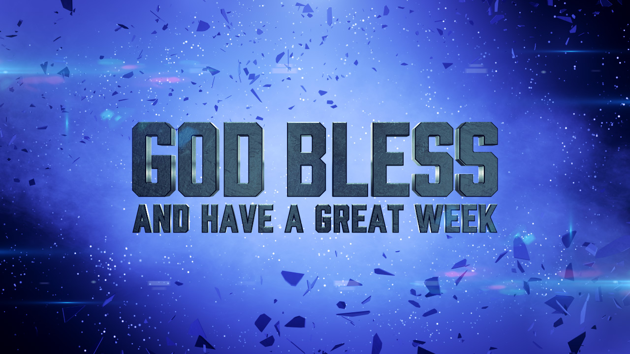 This epic church video background features bold 3D text ìGod Bless and Have a Great Week!î A colossal universe of stars slowly ripples in the distance along with blue haze and drifting shards of glass.