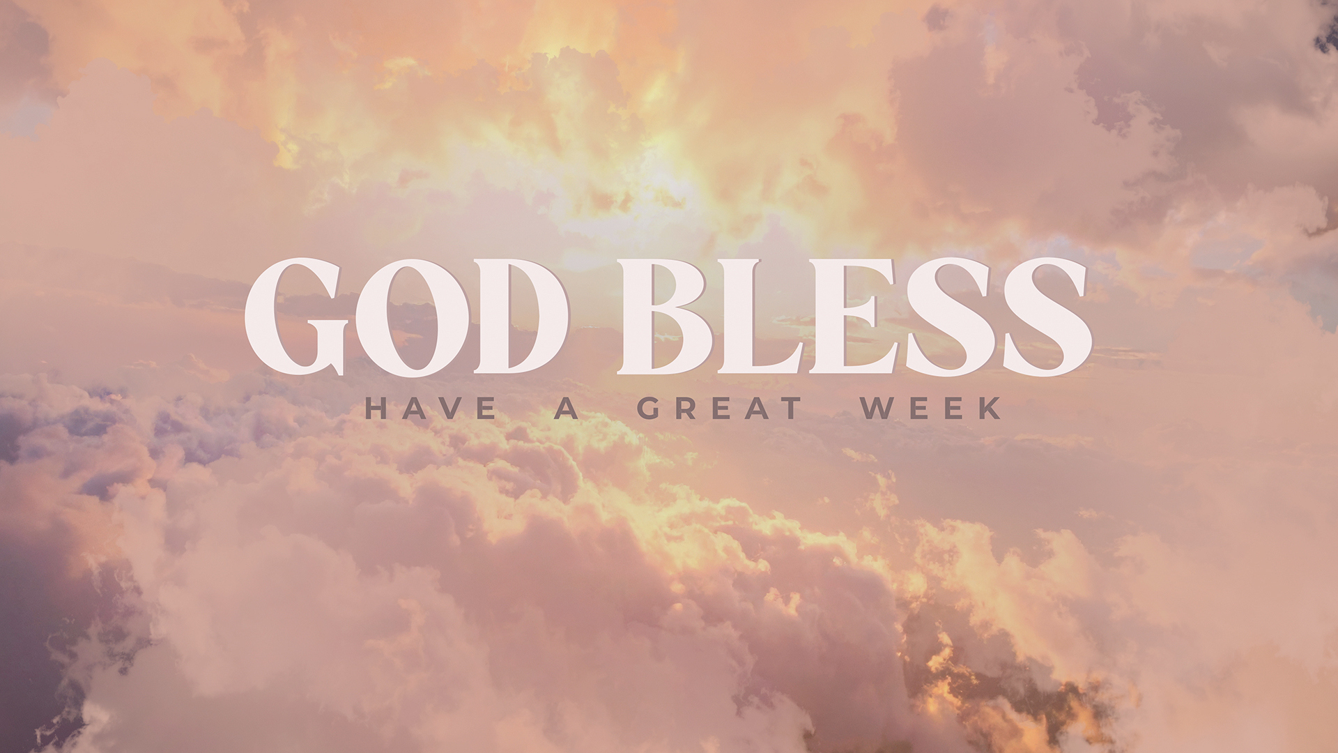 A beautiful heavenly service close title motion over a sky scene showcasing soft, fluffy clouds bathed in warm sunset hues. The sun illuminates the horizon of clouds, creating a dreamlike heavenly atmosphere.