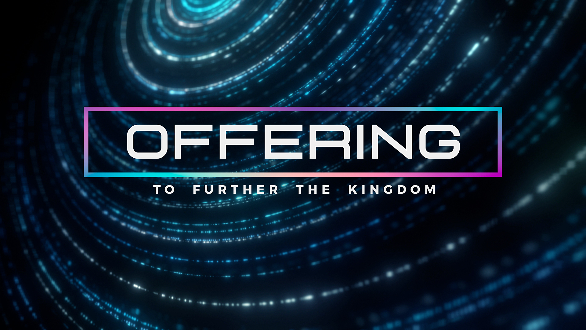 Abstract particle offering and tithes motion title over intricate particle chains in spiral formation with depth of field, subtle light variation and rotation.