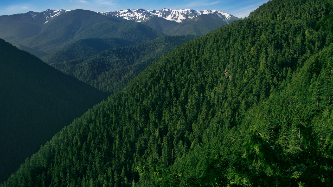 This worship background features snow-capped mountains standing before a deep valley of seemingly endless green pine trees.