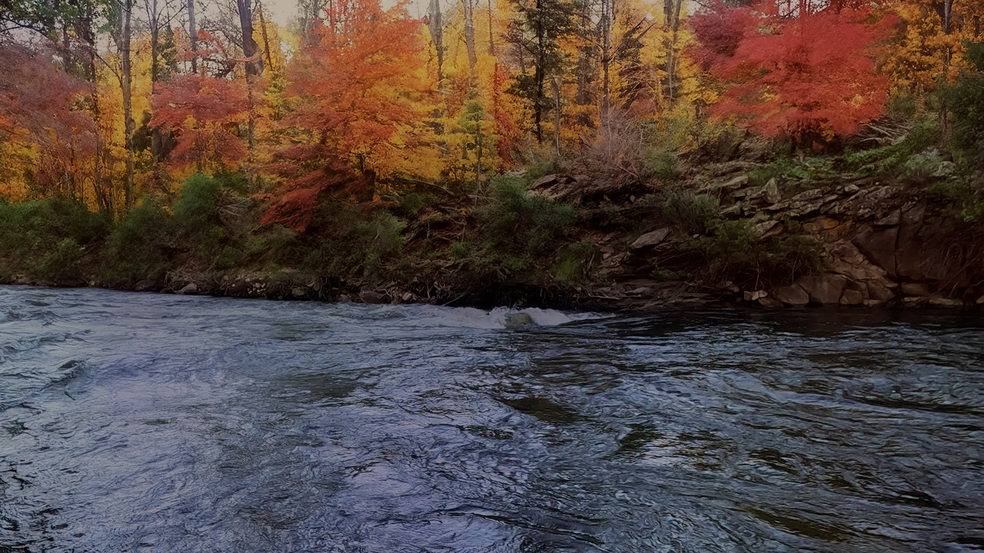 Fall river background worship loop of fall scene with winding river flowing through a vibrant autumnal forest including many vibrant orange, yellow, red, and green trees and large rocks lining the river bank.