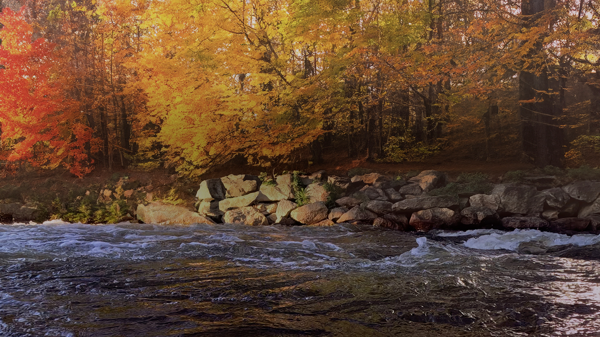 Fall river background worship loop of fall scene with winding river flowing through a vibrant autumnal forest including many vibrant orange, yellow, red, and green trees and large rocks lining the river bank.