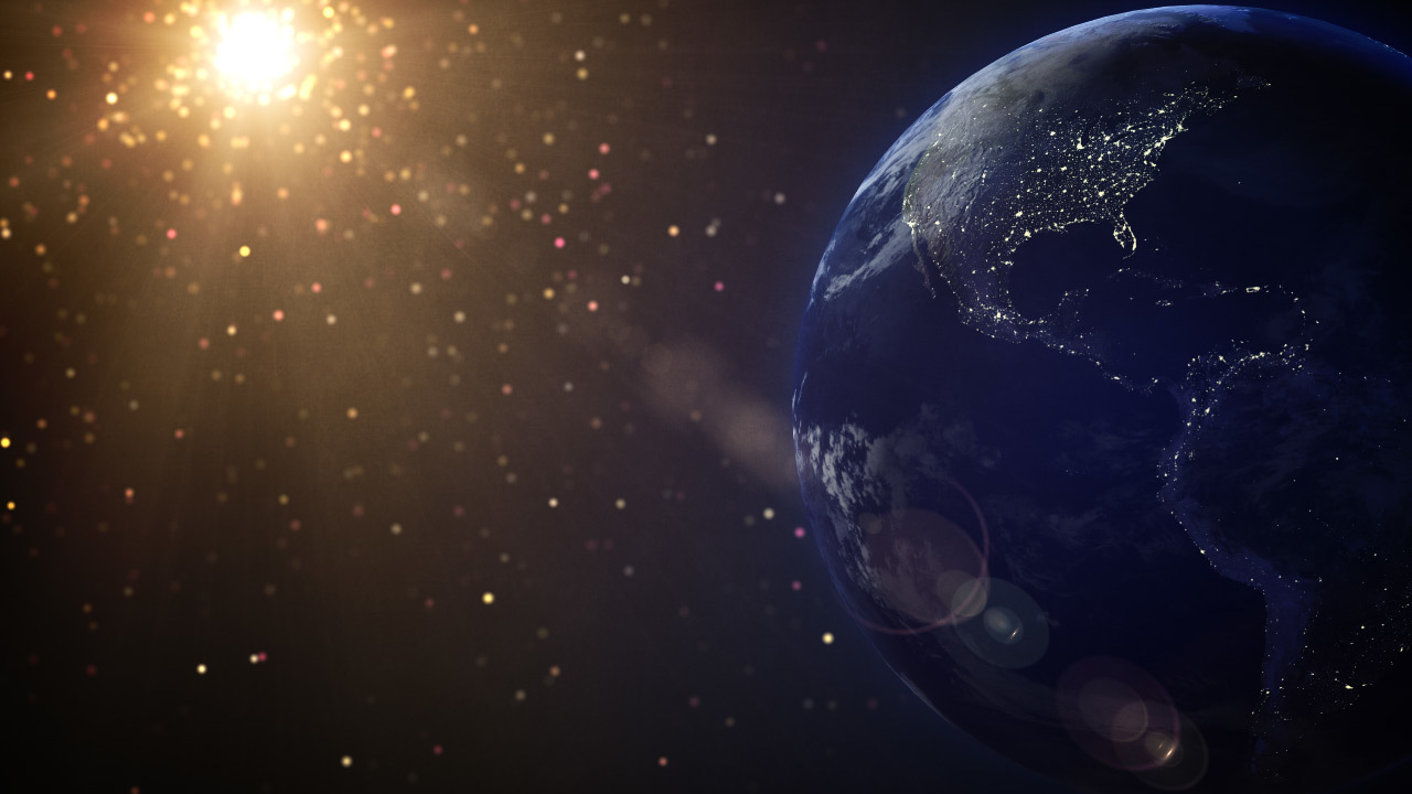 A massive sun emits orange and pink particles, shining golden light rays upon a rotating earth. In this worship background, you can see lights appear across the various countries as day shifts to night.