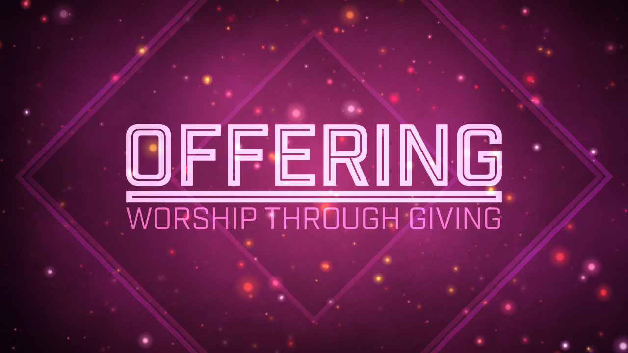 Designed for tithes and giving, this background features bold text “Offering – Worship Through Giving” over a deep pink backdrop. Glowing particles slowly drift in a circular pattern over diamond designs.