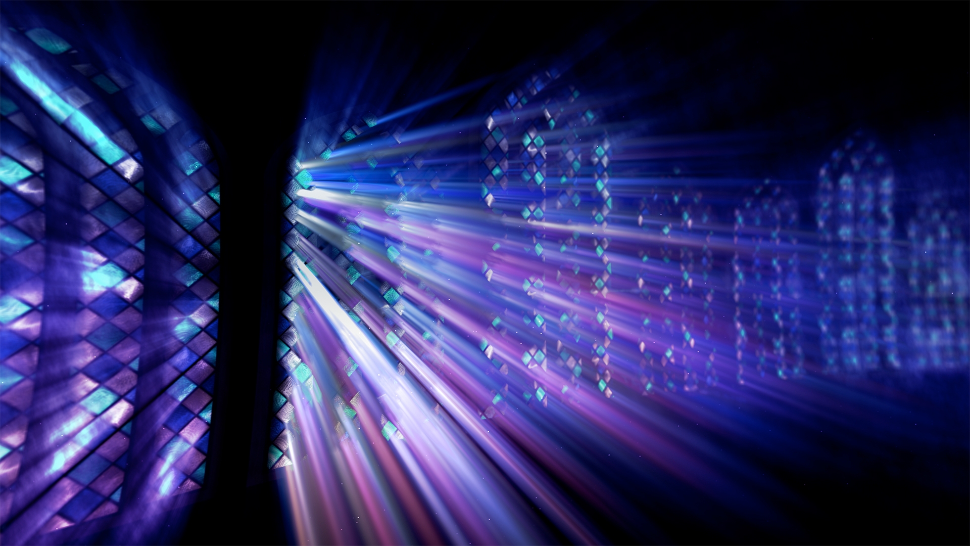 Stained glass windows with ambient light rays shining through various stained glass patterns and colors