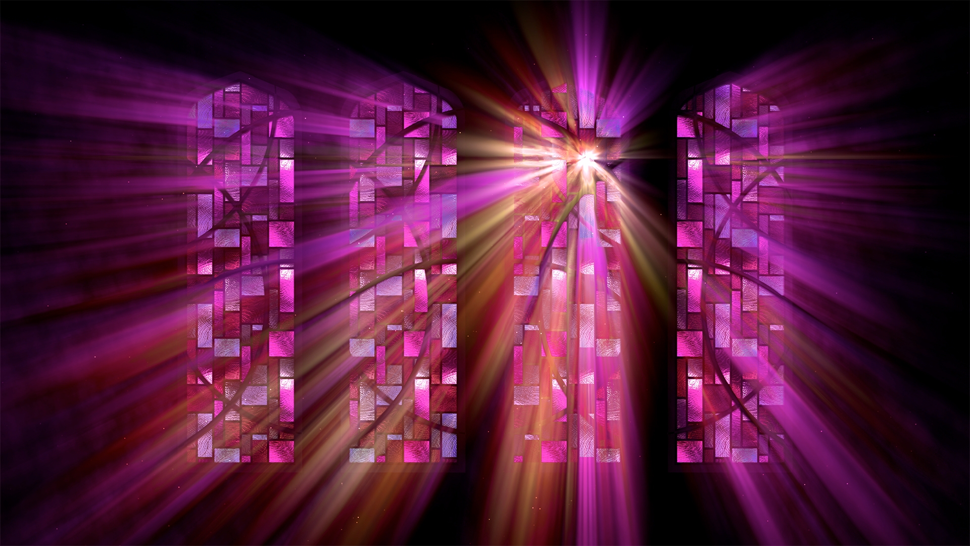 Stained glass windows with ambient light rays shining through various stained glass patterns and colors