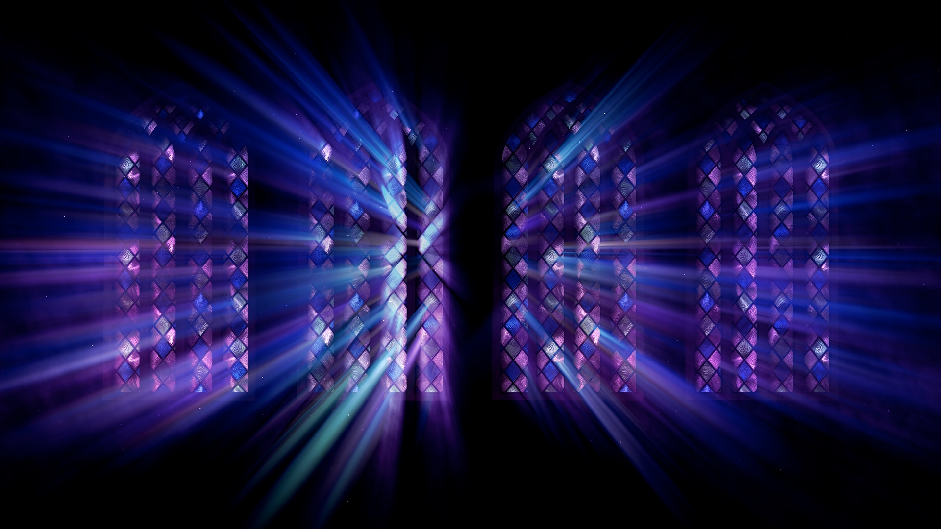 Stained glass windows with ambient light rays shining through various stained glass patterns and colors