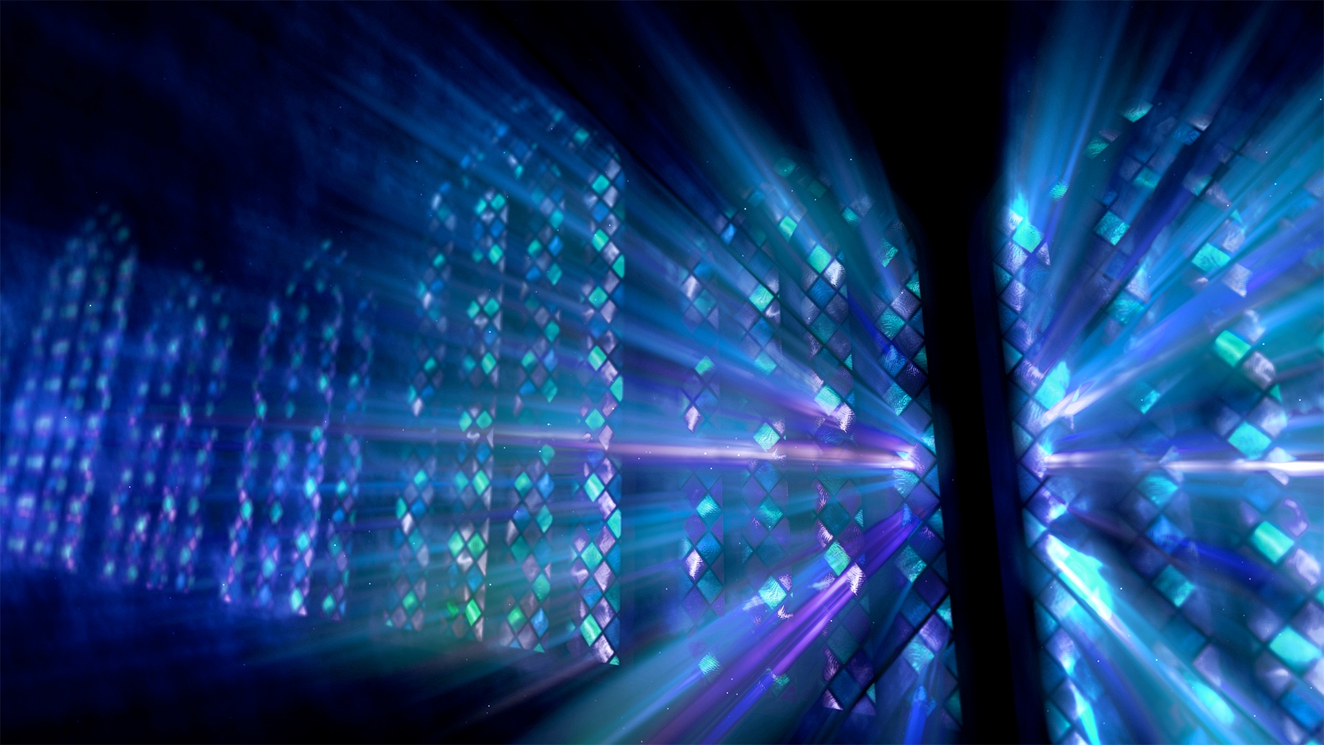 Stained glass windows with ambient light rays shining through various stained glass patterns and colors