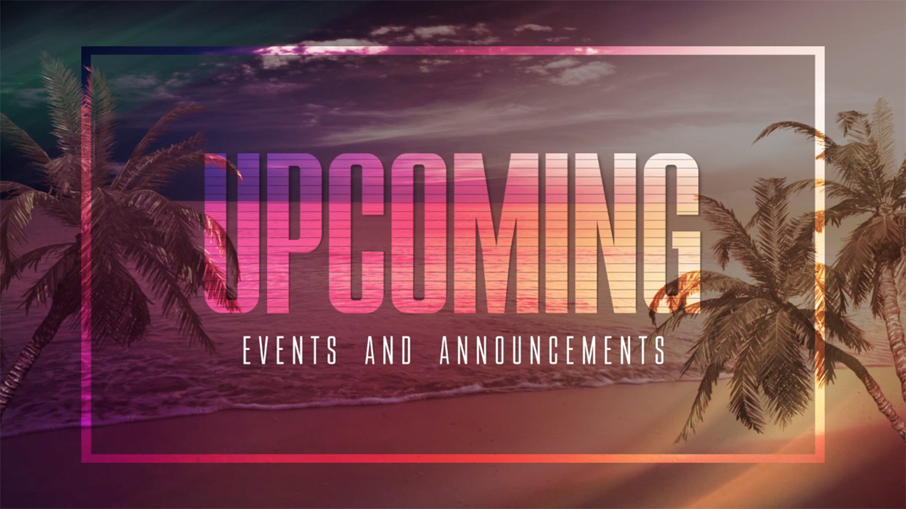 Tropical upcoming events and announcements title animation over ocean scene with clouds and palms perfect for summer.