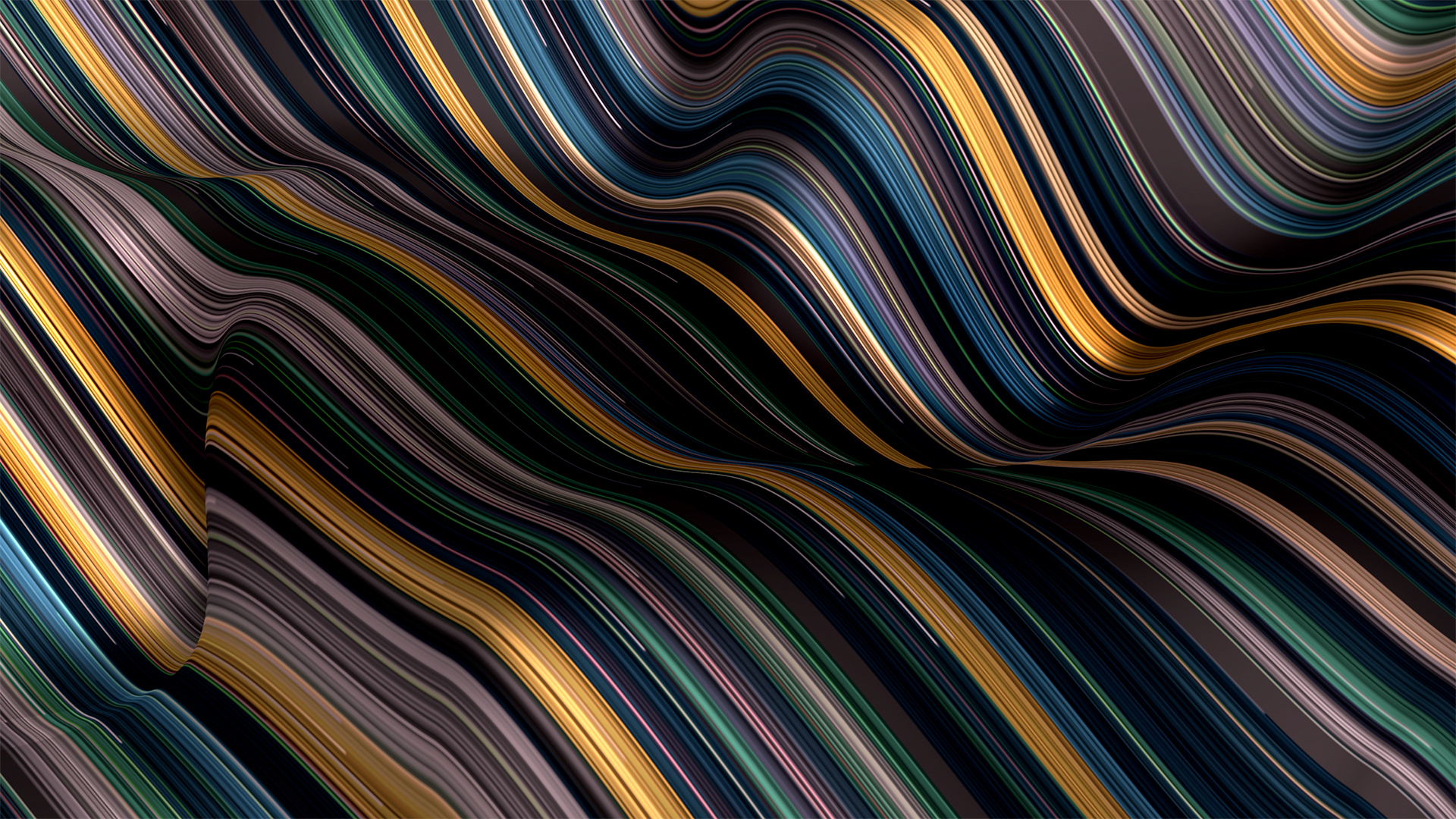 Wavelength gradient flow line waves in 3d depth with bright colorful fractal bars and vibrant line particles.