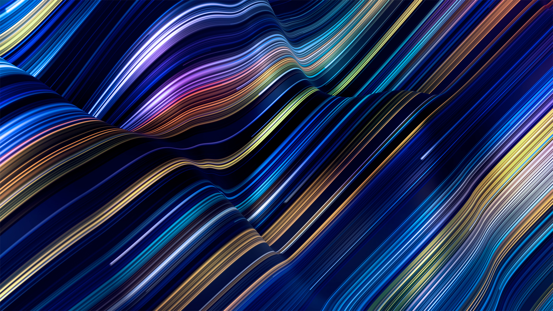 Wavelength gradient flow line waves in 3d depth with bright colorful fractal bars and vibrant line particles.