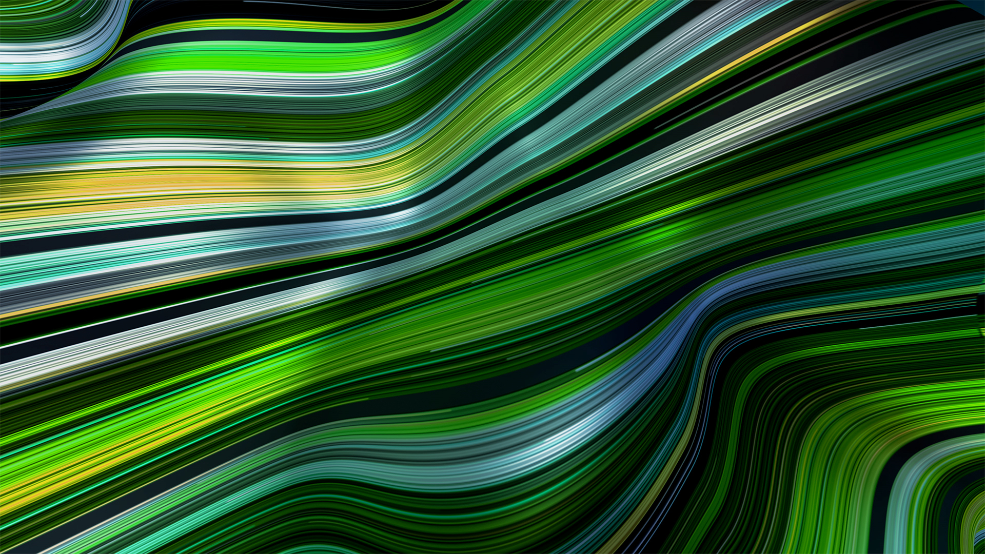 Wavelength gradient flow line waves in 3d depth with bright colorful fractal bars and vibrant line particles.